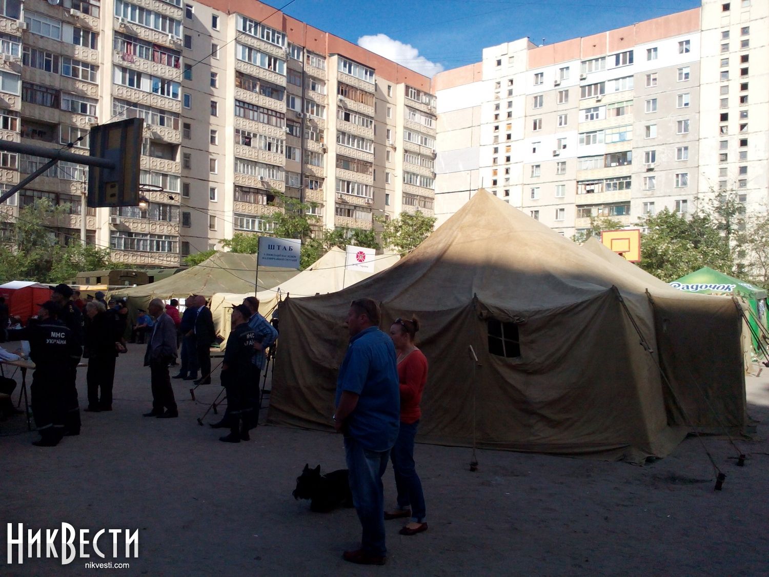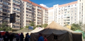В Николаеве во дворе по адресу Лазурная, 40, где сегодня прогремел взрыв в десятиэтажке, спасатели обустроили лагерь для эффективной работы ведомств, принимающих участие в ликвидации последствий чрезвычайного происшествия. Лагерь состоит из трех штабных палаток.