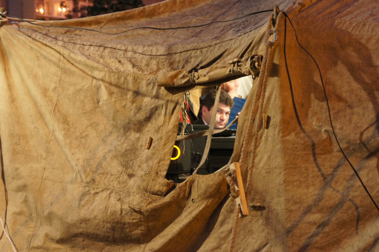 22:40. В одной из штабных палаток оказывают медицинскую помощь одному из спасателей, которому при демонтаже одной из плит осколком задело бровь.