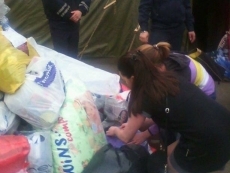 14:59. Приехал микроавтобус, в который сотрудники Красного креста и волонтеры загружают гуманитарную помощь - детские игрушки, теплую одежду, одеяла, постельное белье, продукты питания. Груз доставят к месту поселения пострадавших жильцов - гостинице "Турист".