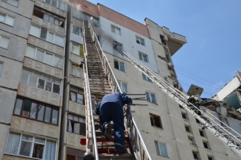 Сотрудники Государственной службы по чрезвычайным ситуациям пытаются эвакуировать пожилых людей, которые живут на 9 этаже в квартире, смежной с той, которая взрорвалась.
