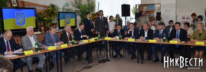 Как передает корреспондент НикВестей, в президиум круглого стола вошли экс-президенты Украины Леонид Кравчук и Леонид Кучма, премьер-министр Арсений Яценюк, представитель ОБСЕ Вольфган Шингер, министры Владимир Гройсман и Руслан Князевич, а также председатель облсовета Тарас Креминь и губернатор области Николай Романчук.