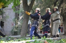 С помощью подъемного крана спасатель поднимается к деревьям и распиливает их бензопилой. Другие тем временем тянут трос, обеспечивая безопасное падение дерева, - сообщает корреспондент НикВестей с места событий.