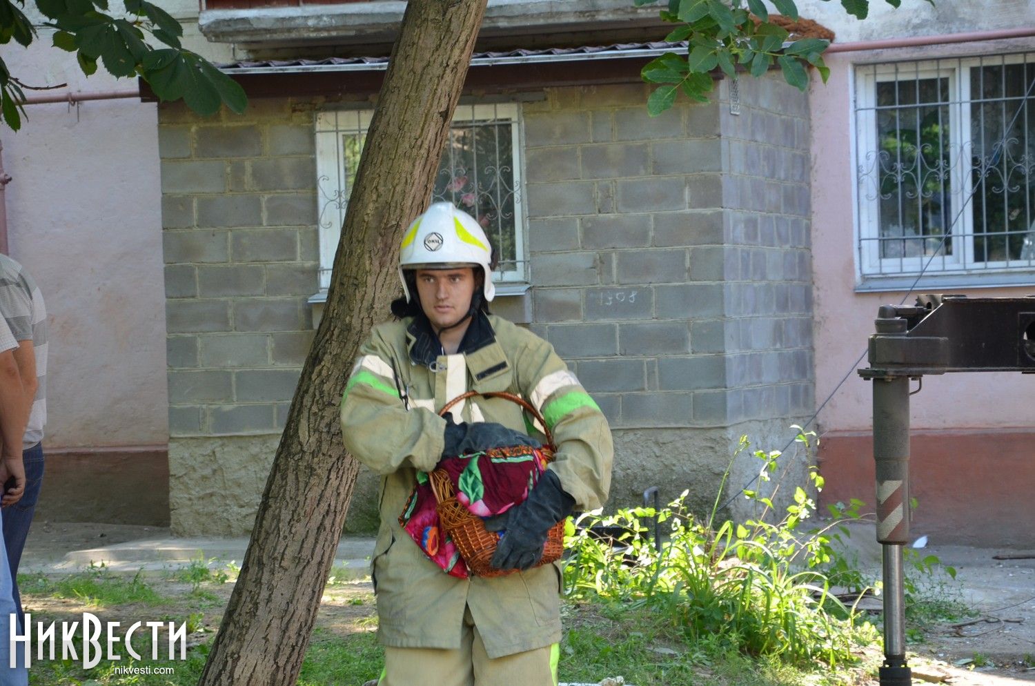 Она отдала спасателю ключ от квартиры, чтобы он достал кота. Через некоторое время МЧС-ник, отыскав питомца, вынес его в корзине из дома.