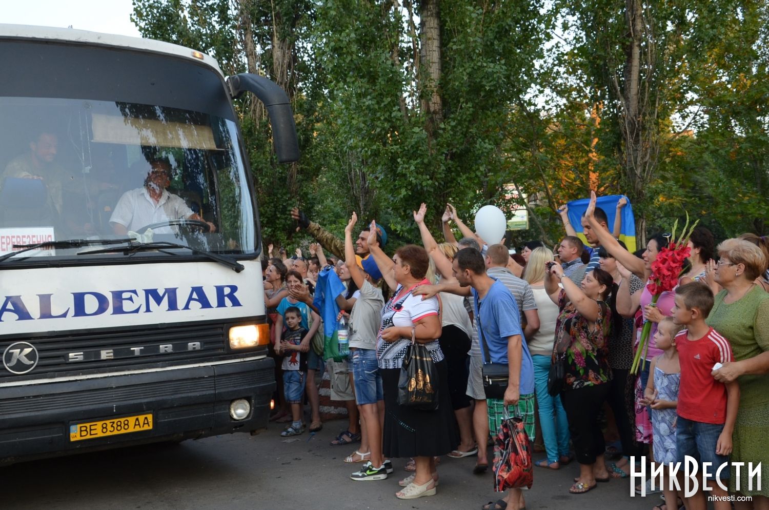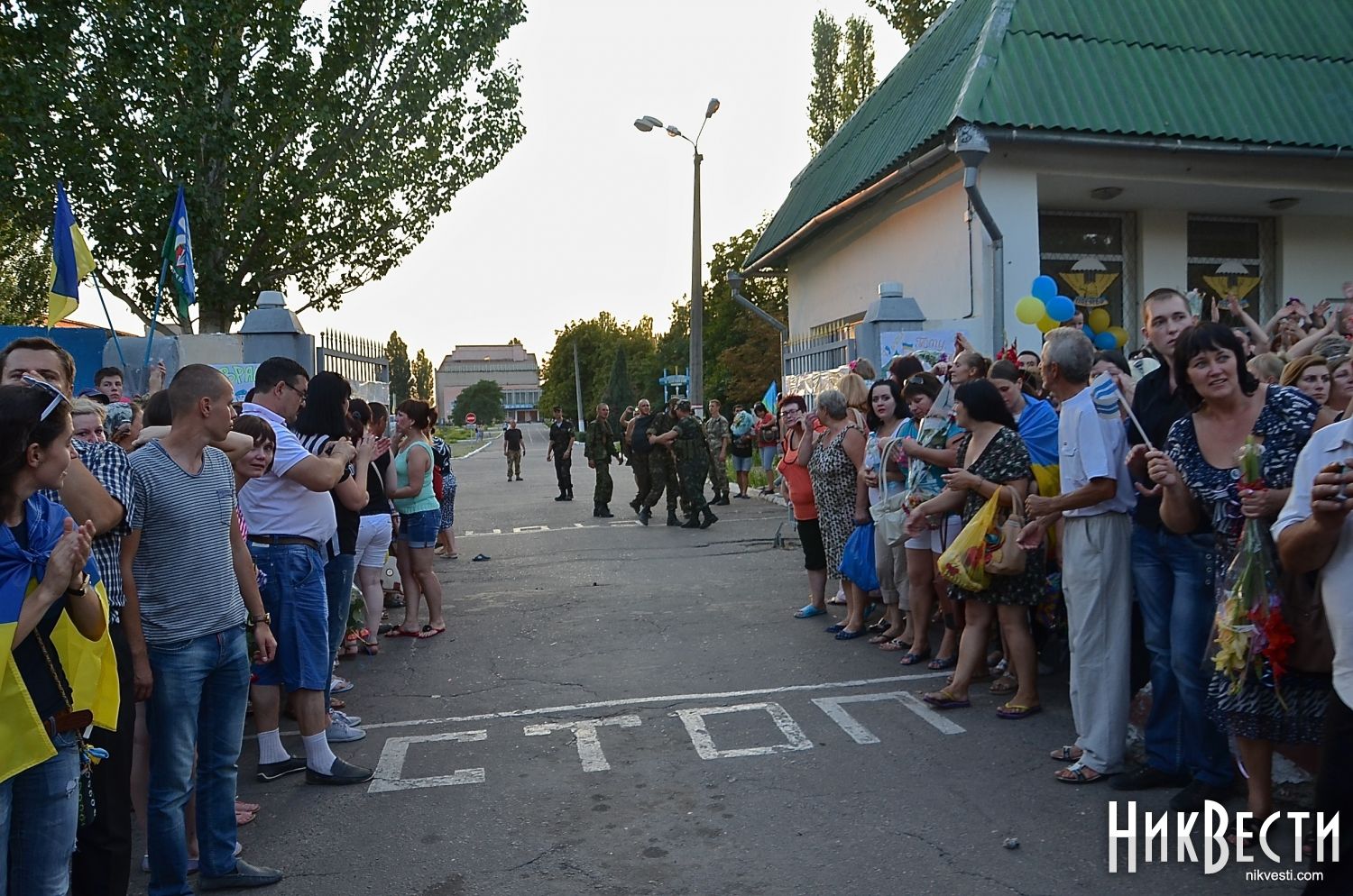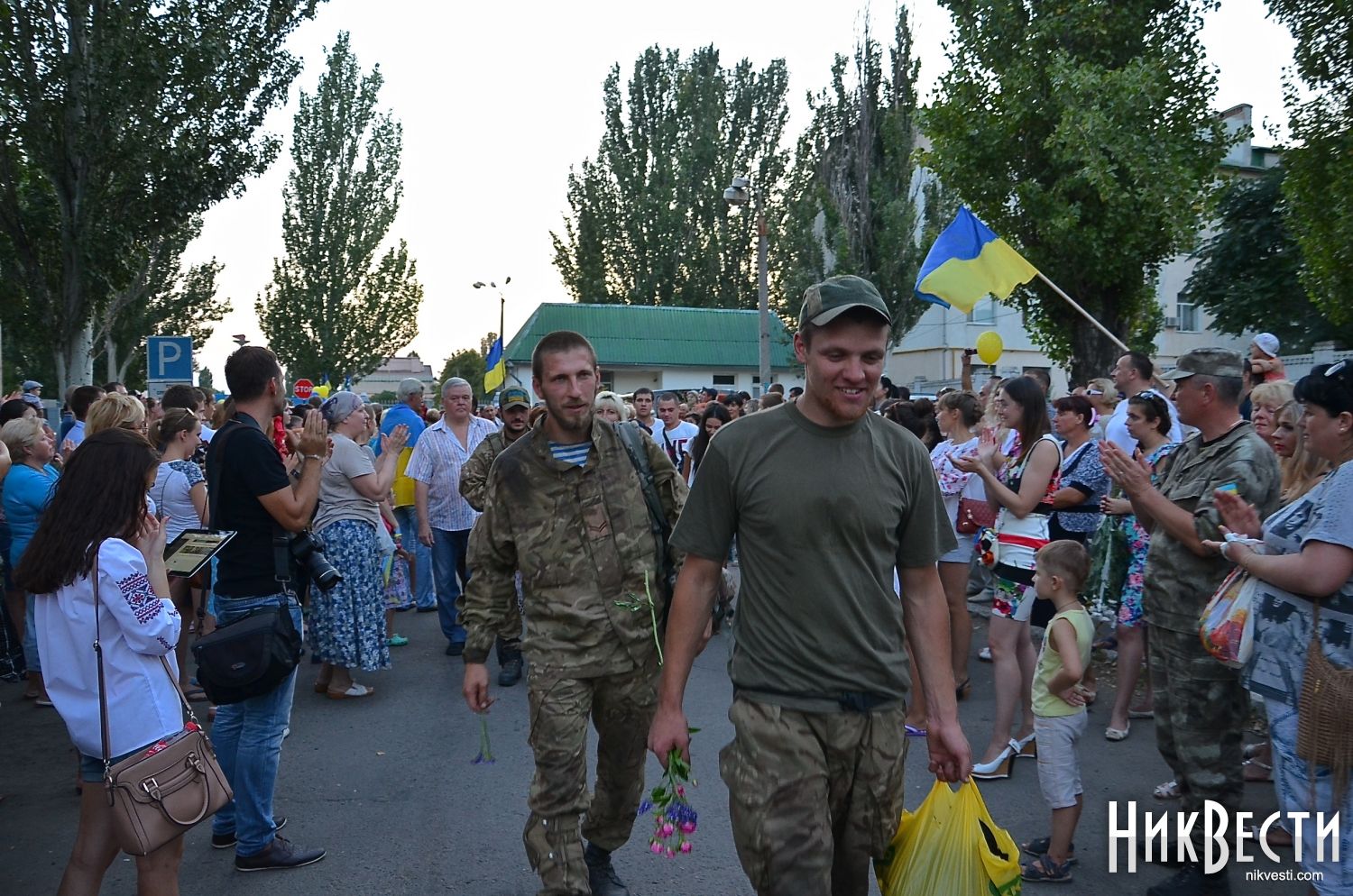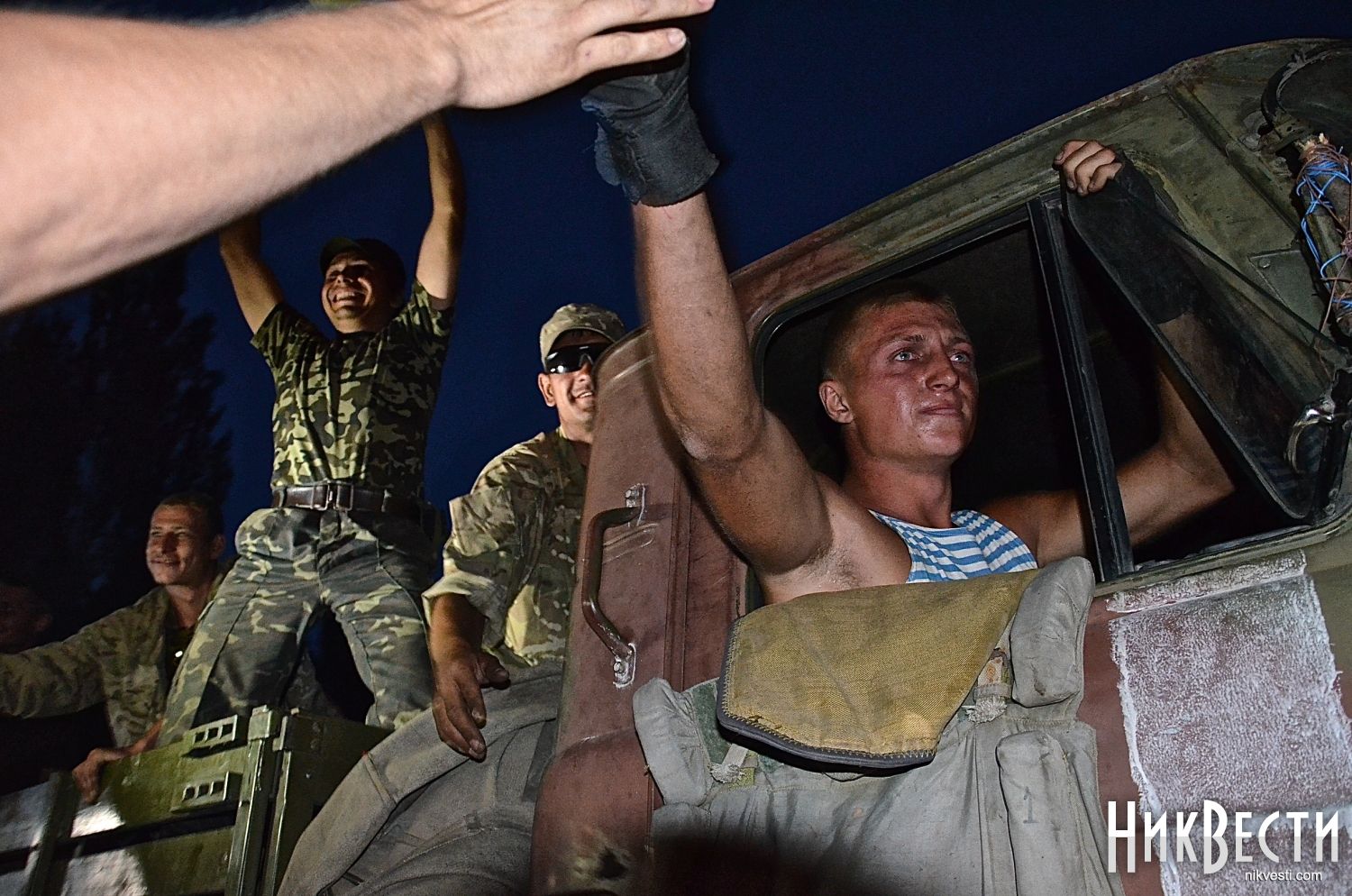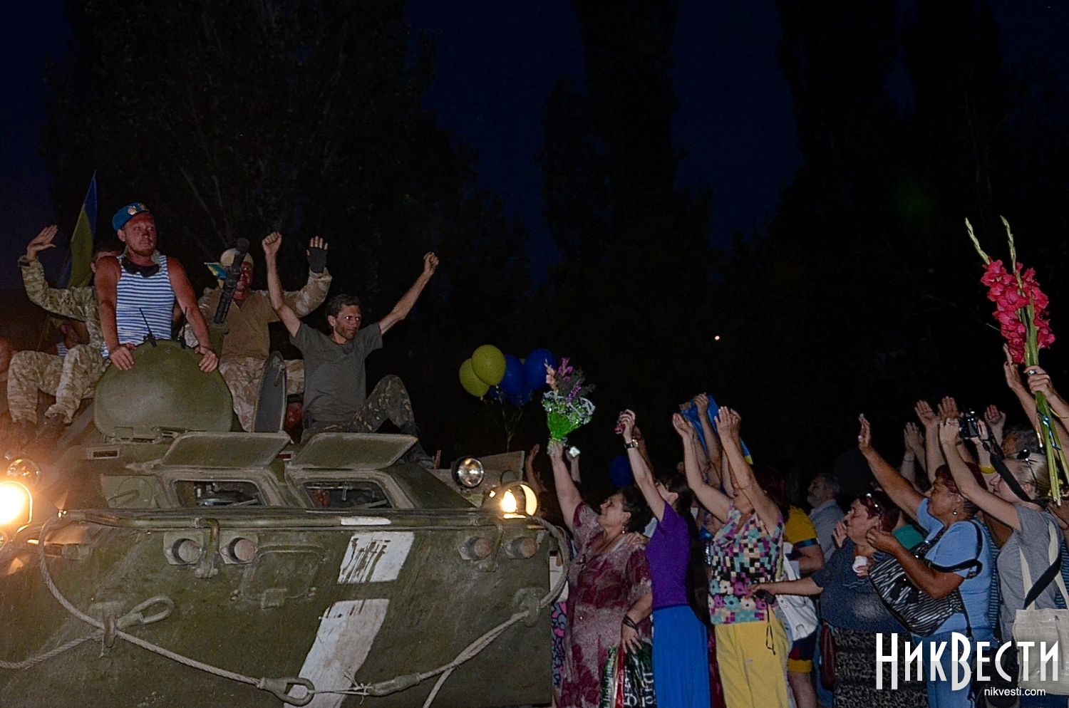 Часть военных приехала на автобусах, остальные - верхом на бронетехнике и военном транспорте. Николаевцы встречали их криками "Вы герои", "Слава героям" или просто благодарили их за проявленную отвагу и дарили цветы или обнимали.