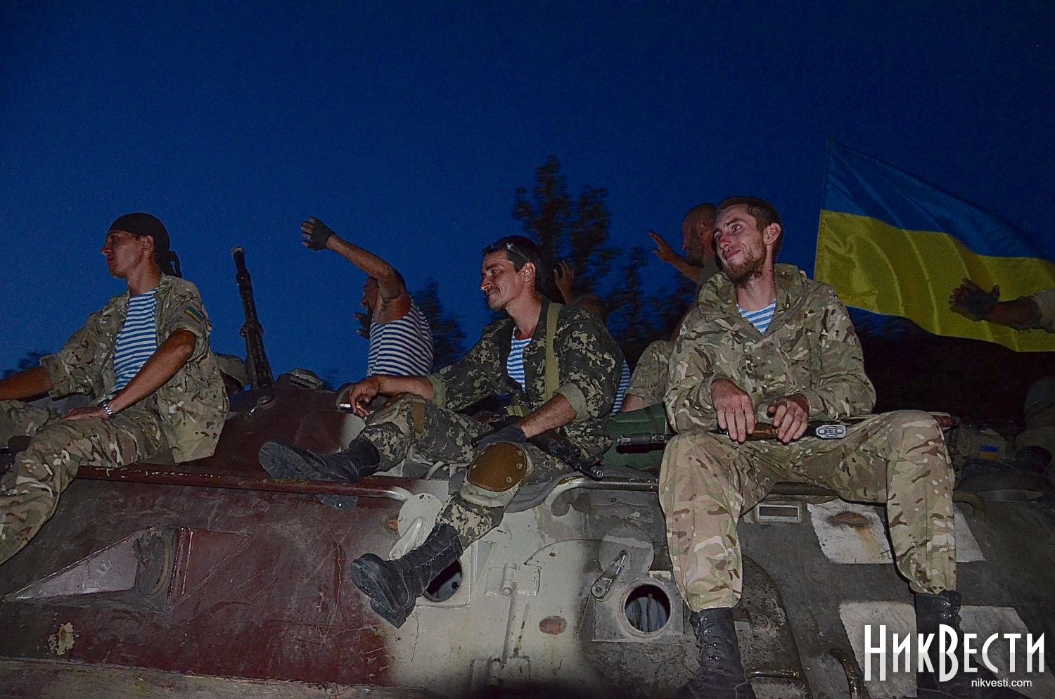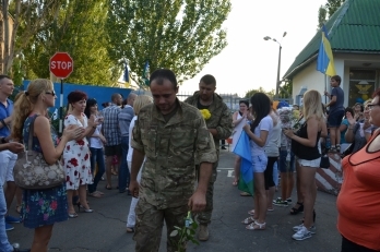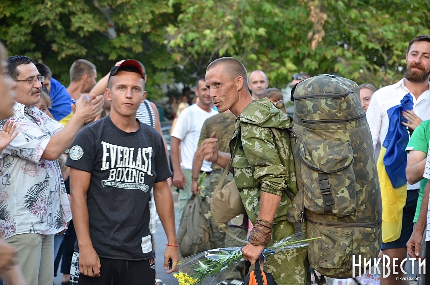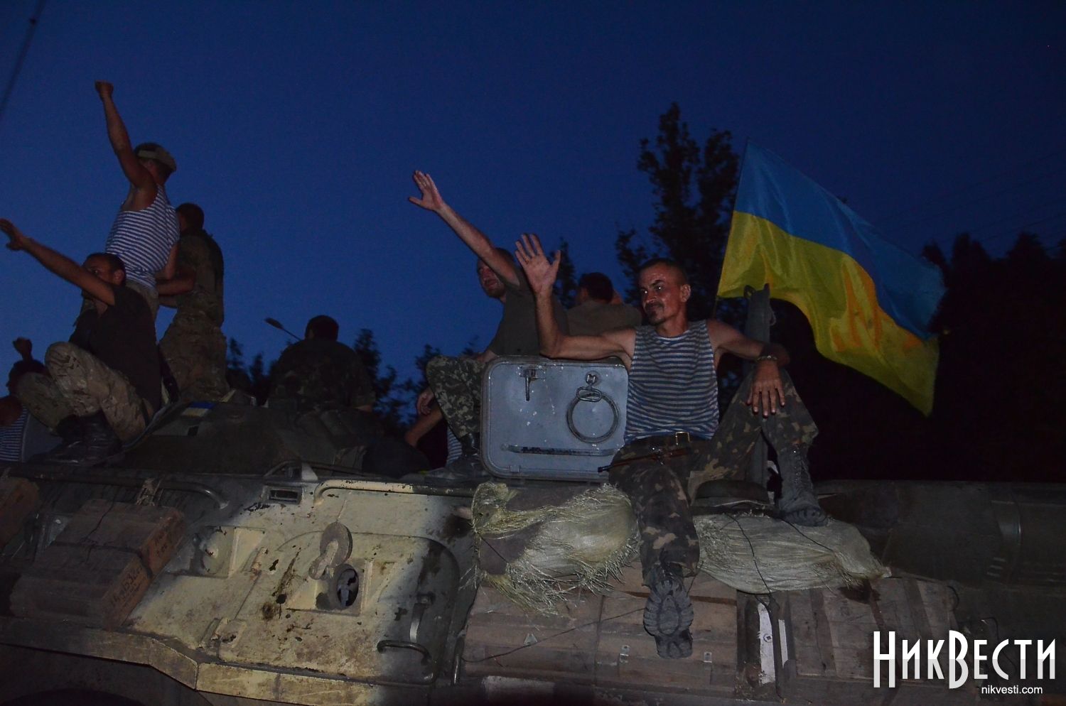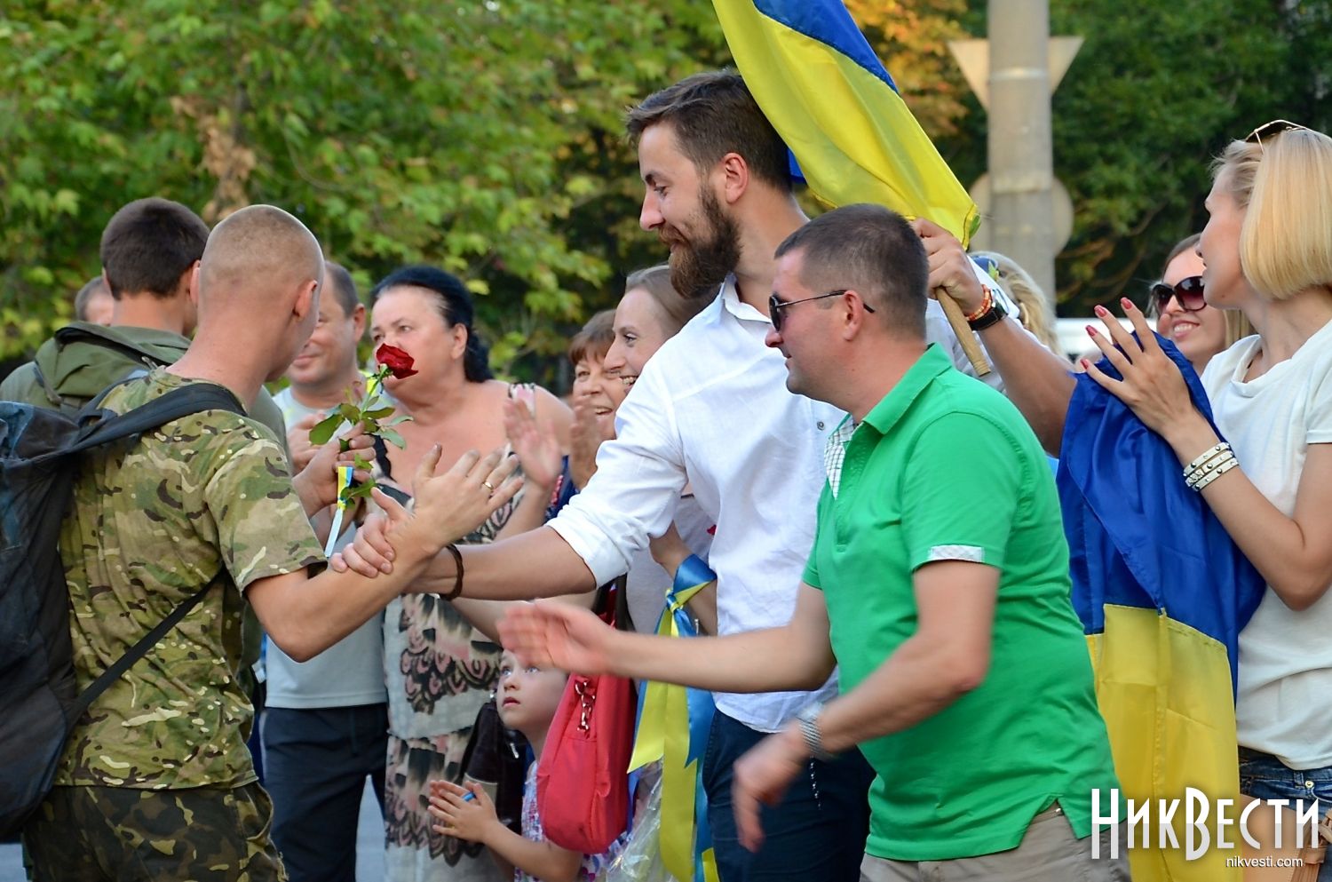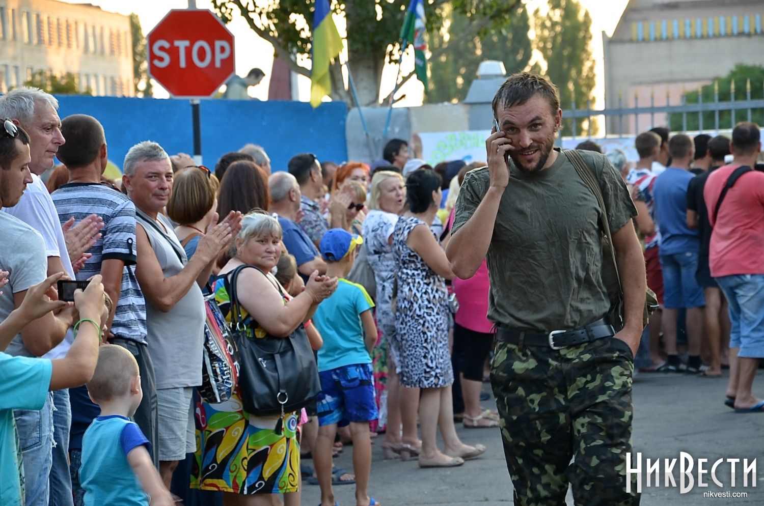 Часть военных приехала на автобусах, остальные - верхом на бронетехнике и военном транспорте. Николаевцы встречали их криками "Вы герои", "Слава героям" или просто благодарили их за проявленную отвагу и дарили цветы или обнимали.