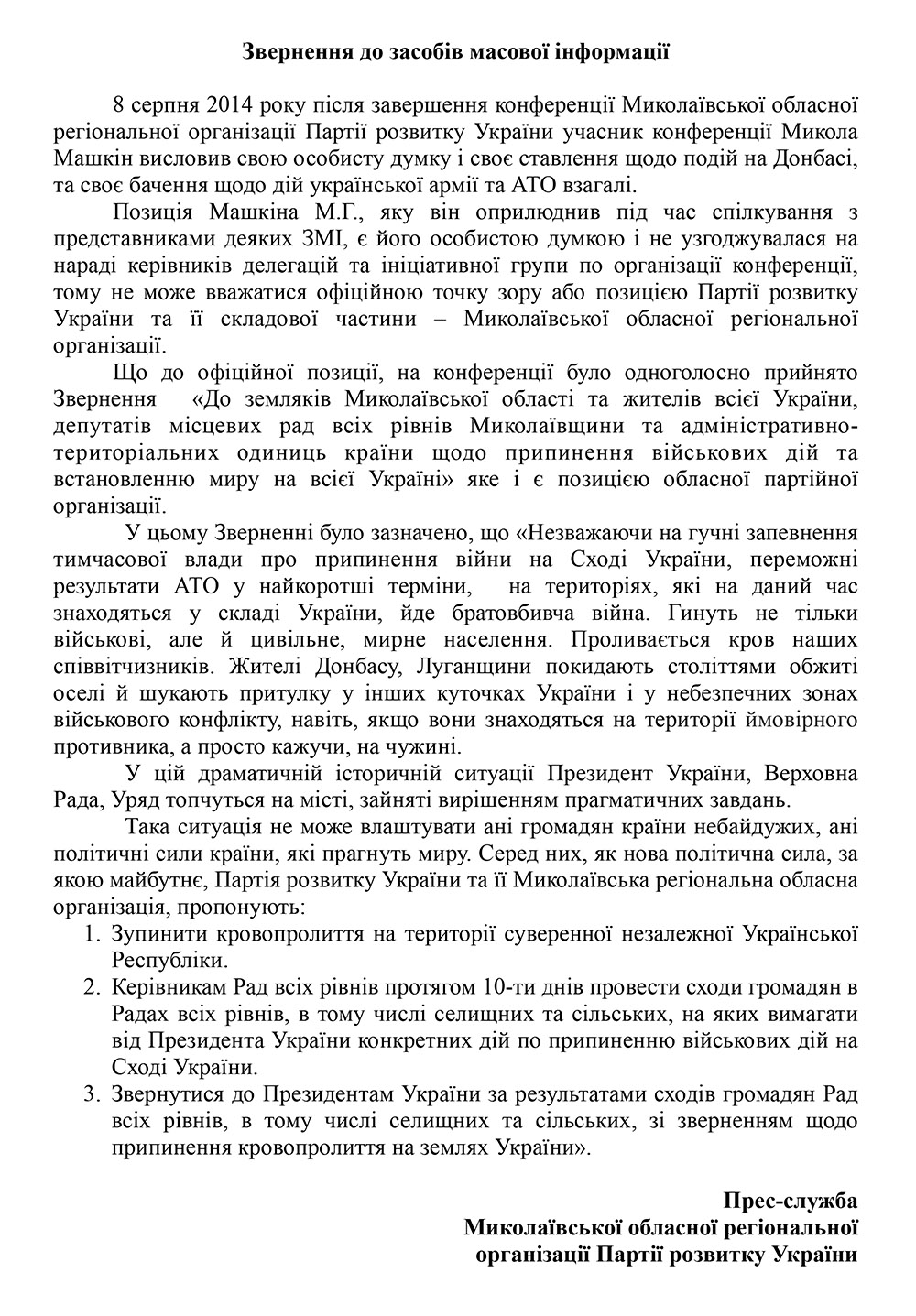 В «Партии развития Украины», которая была сформирована преимущественно из бывших представителей Партии регионов, заявили, что член партийного исполкома, депутат Николаевского областного совета Николай Машкин не согласовал свои мысли с партийной верхушкой, прежде чем общаться с журналистами.