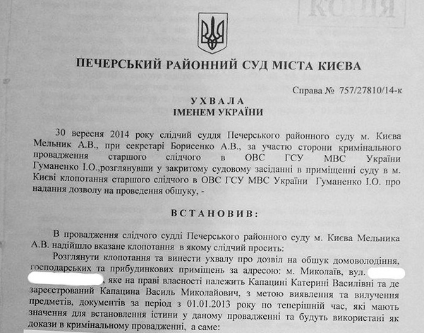 Обновлено 18:00 Издание «Преступности.НЕТ» опубликовало постановление Печерского районного суда города Киева, которым судья Мельник А.В. дал санкцию на обыск домовладений, хозяйственных и придомовых помещений в Николаеве, которые имеют отношение к Василию Капацыне.