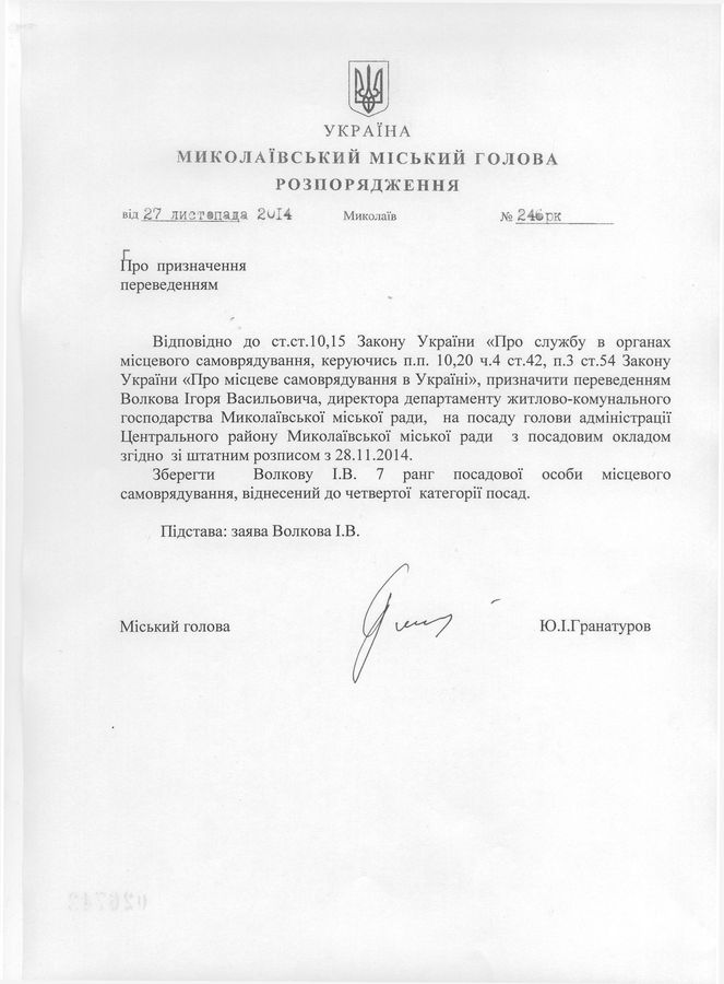 Сегодня, 27 ноября, Николаевский городской голова Юрий Гранатуров подписал распоряжение о назначении на должность главы администрации Центрального района Игоря Волкова.