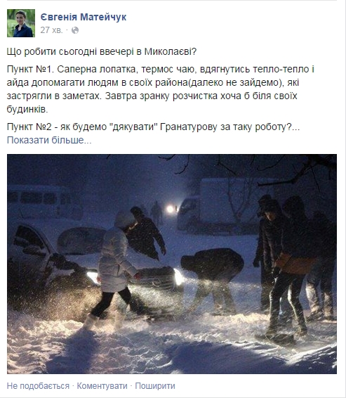 Еще один николаевец по имени Олег Кондрик в группе "Маршрутки Николаева" объявил о сборе желающих для расчистки снега после бури, начиная от "Пушкинского кольца" в сторону Советской по проспекту Ленина.