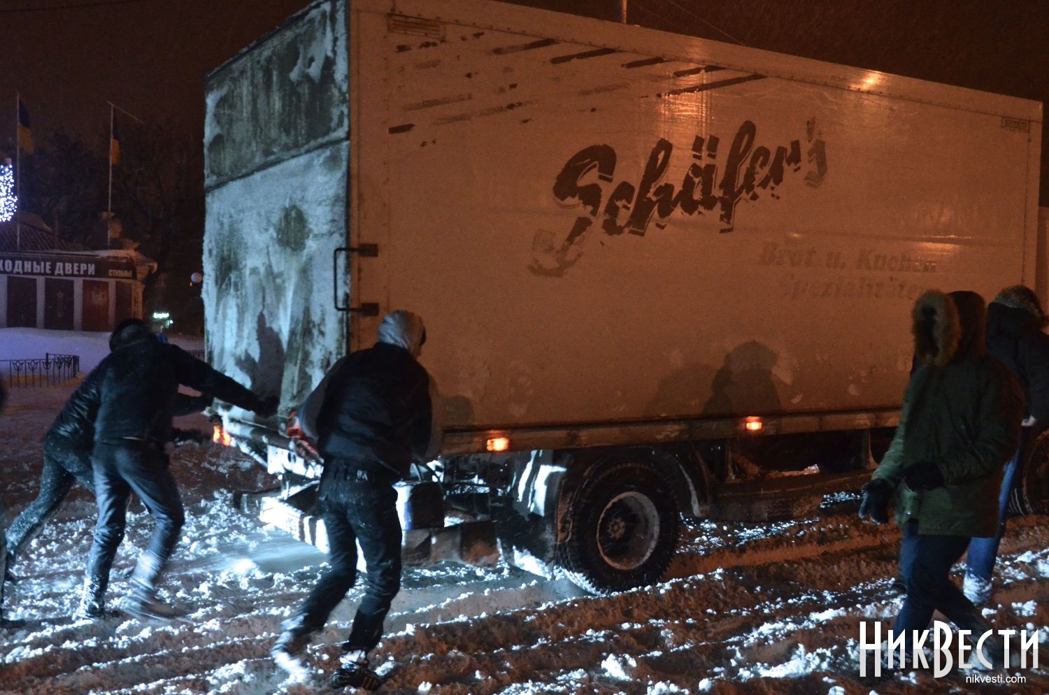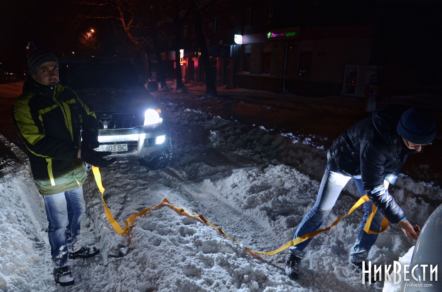 Среди тех, кто минувшей ночью не покладая рук трудился, доставая машины и разгребая снег, были и известные николаевцы. В частности, корреспондент НикВестей застал за работой и пообщался с лидером николаевской «Свободы» Демидом Губским, с лидером «Самопомощи» Александром Сенкевичем, вице-губернатором Оксаной Янишевской, общественником Александром Максименко, а также с николаевским адвокатом Федором Панченко.