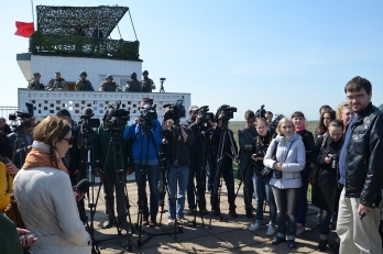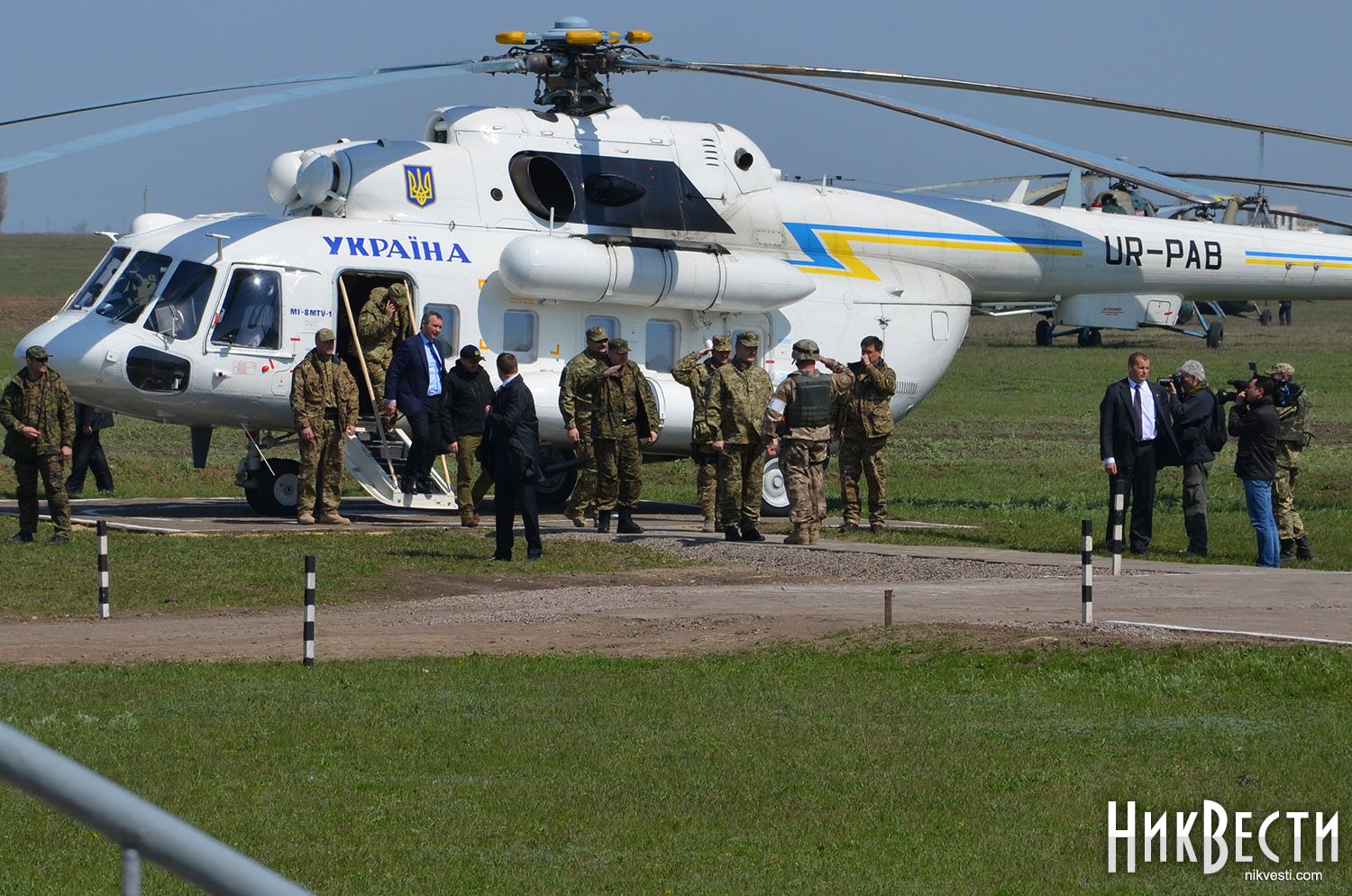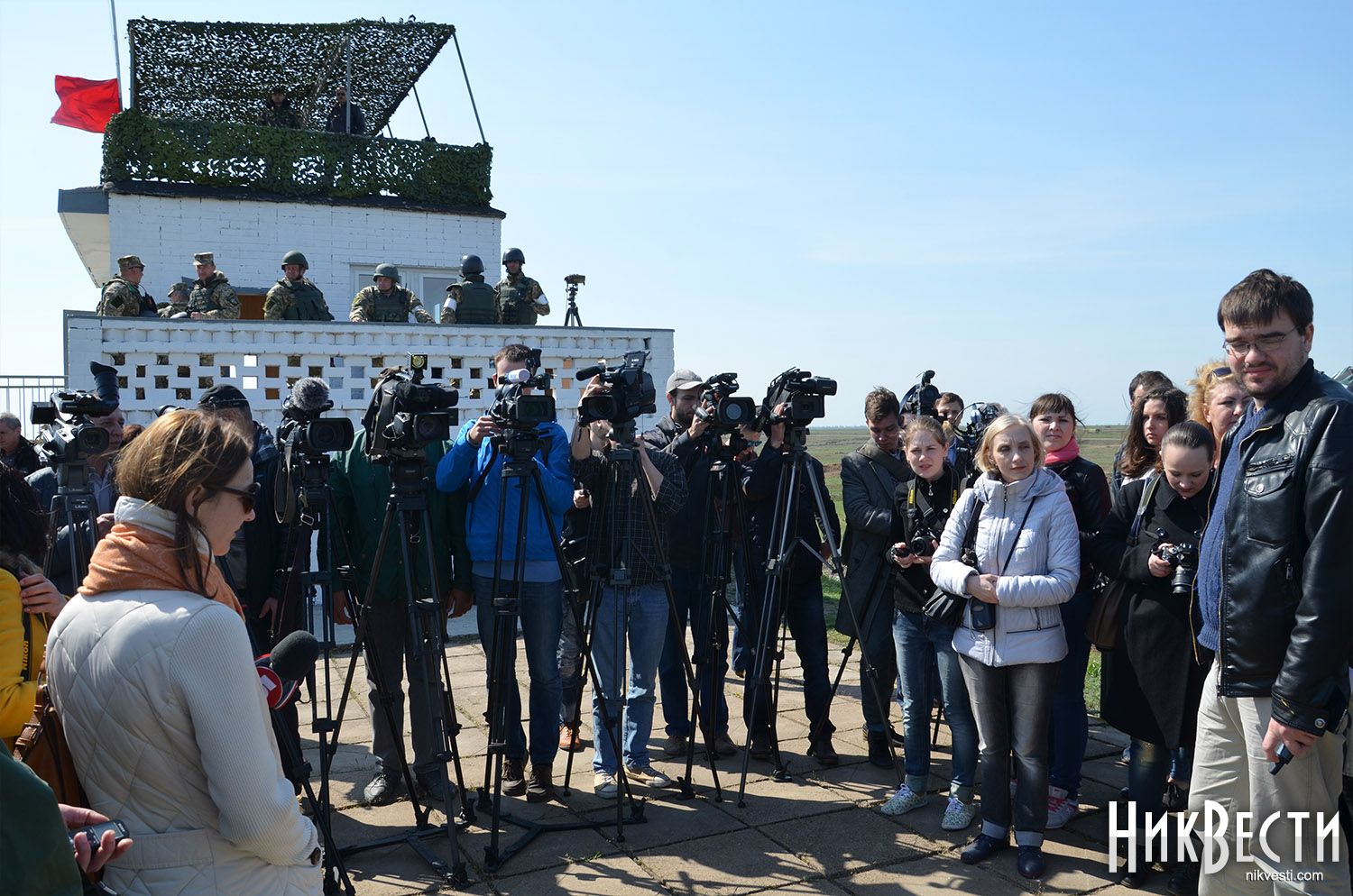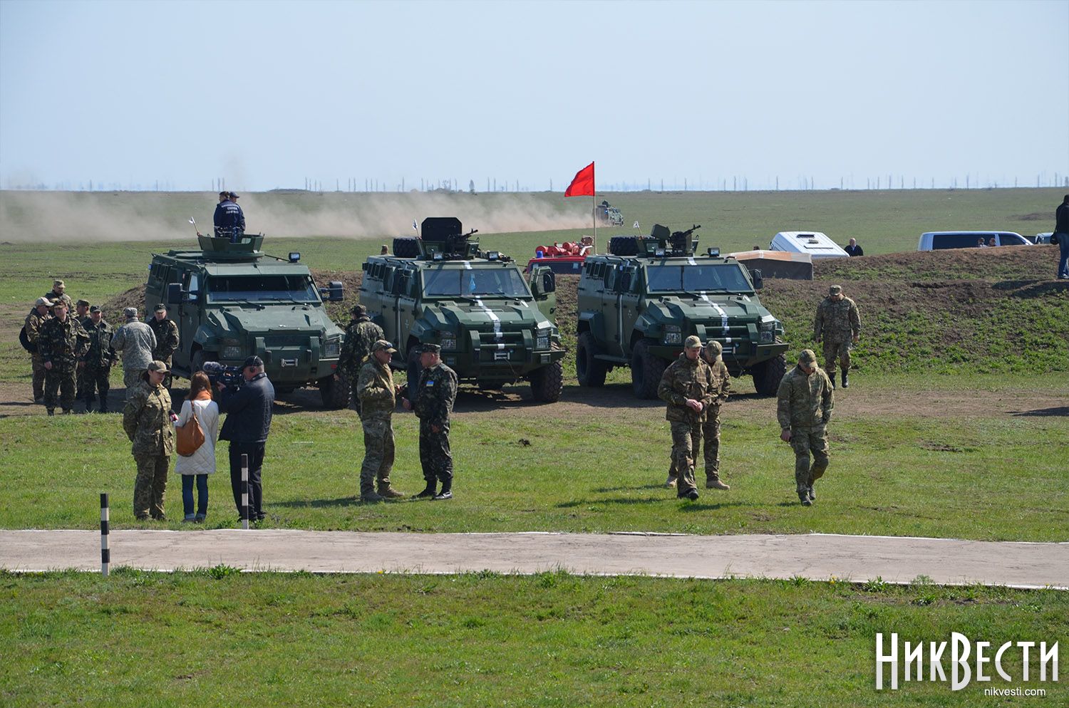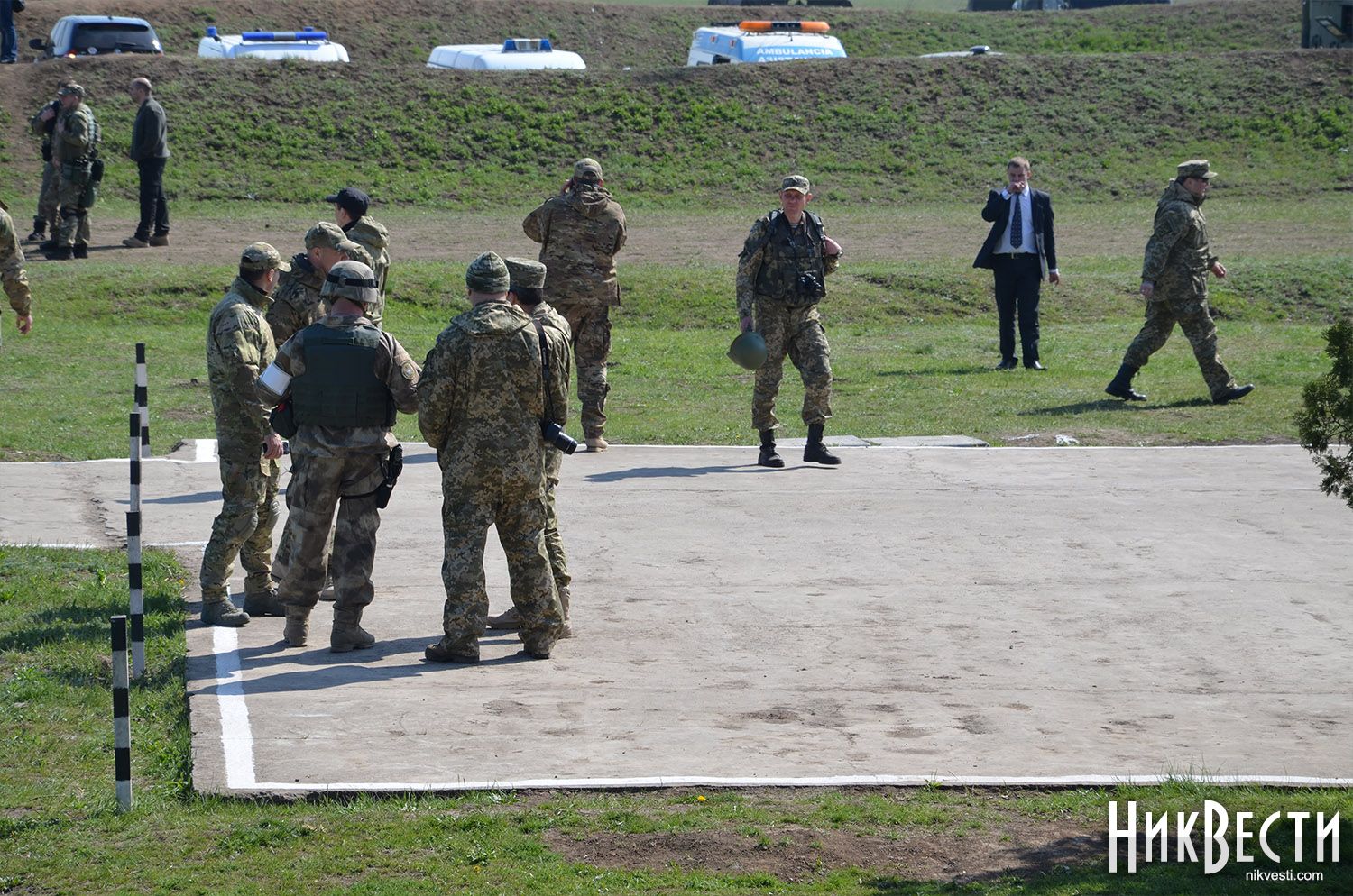 На полигоне присутствуют Секретарь Совета национальной безопасности и обороны Украины Александр Турчинов и председатель Николаевской областной государственной администрации Вадим Мериков, а также волонтеры Юрий Бирюков и Татьяна Рычкова.