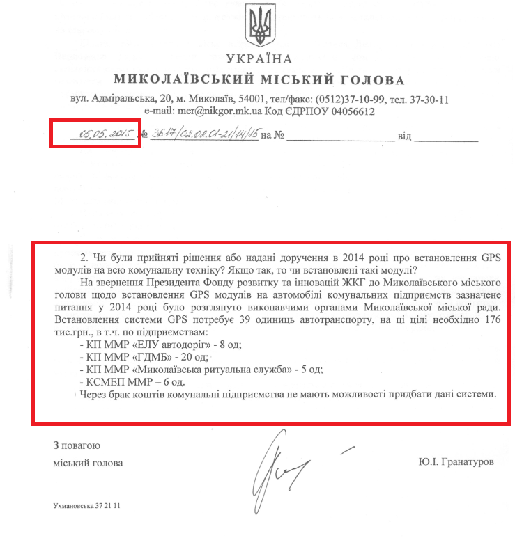 Отметим, что в феврале 2014 года Юрий Гранатуров, будучи в должности исполняющего обязанности мэра Николаева, заявил о намерении установить GPS на всю коммунальную технику.