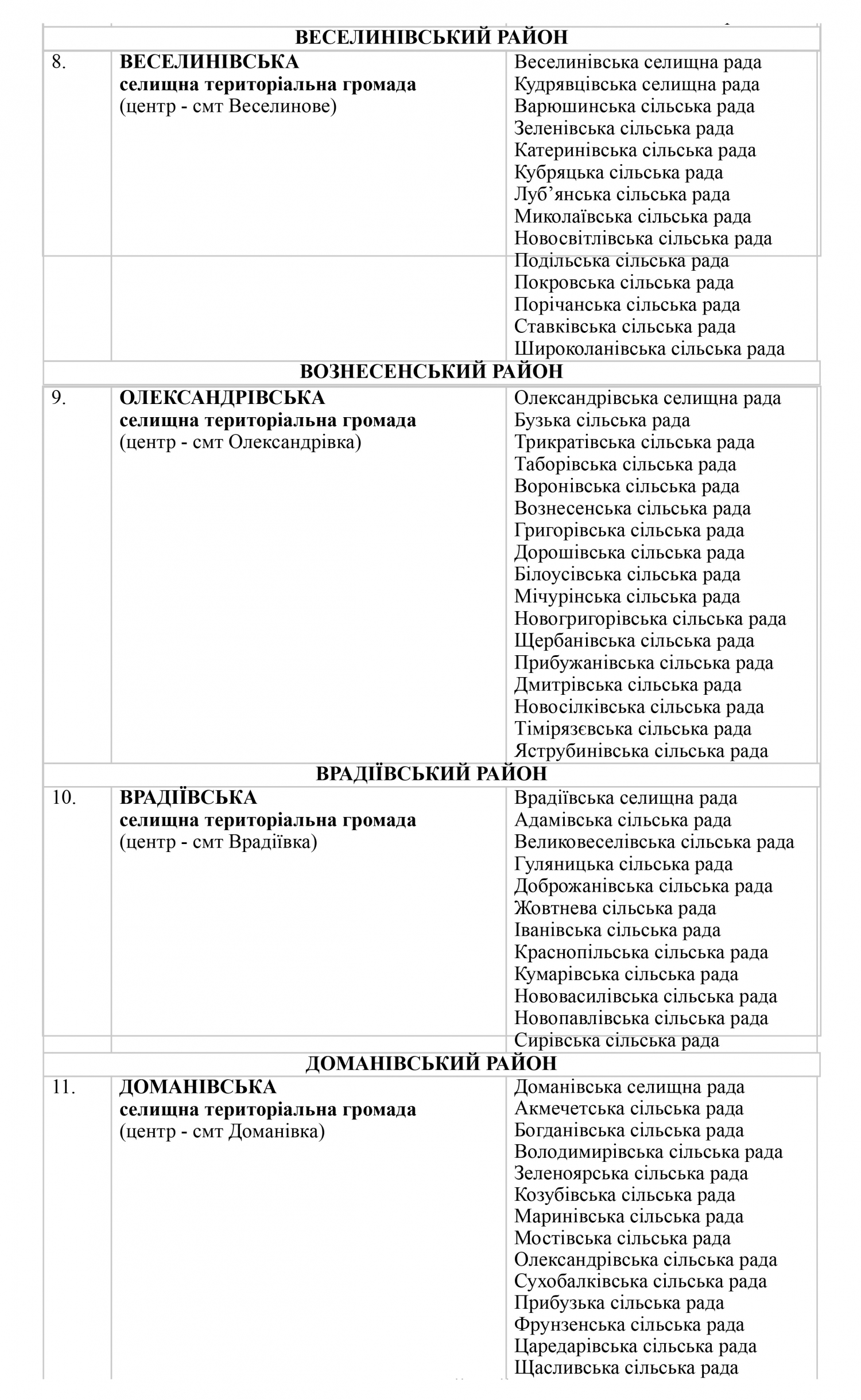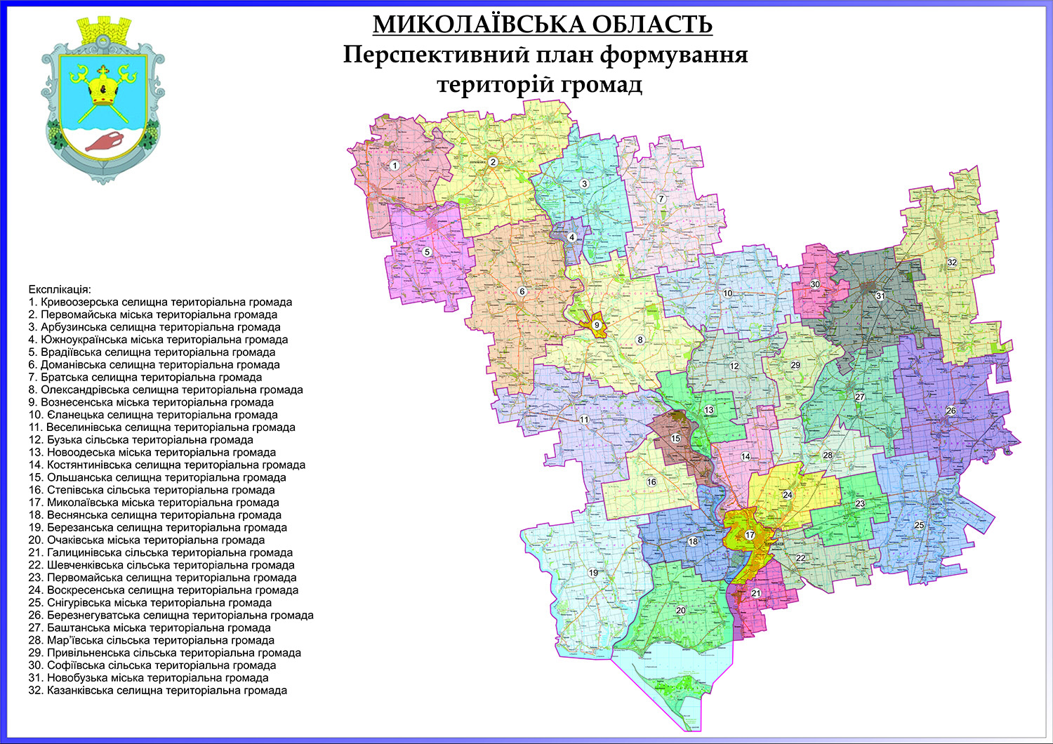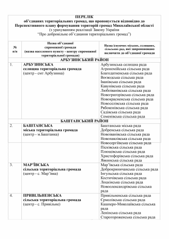 Планируется создание 14 объединенных территориальных общин, которые намерены объединить все территориальные громады соответствующего района – Арбузинская (за исключением Константиновского поселкового совета), Березанская, Березнегуватская, Братский, Веселиновская, Вознесенская, Врадиевская, Доманевская, Еланецкая, Казанковская, Кривоозерская.