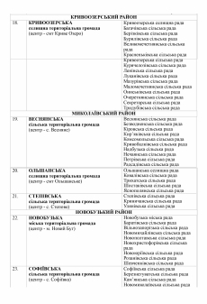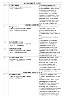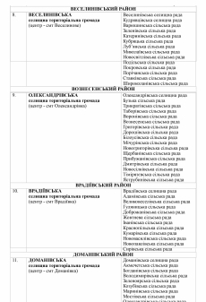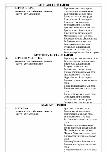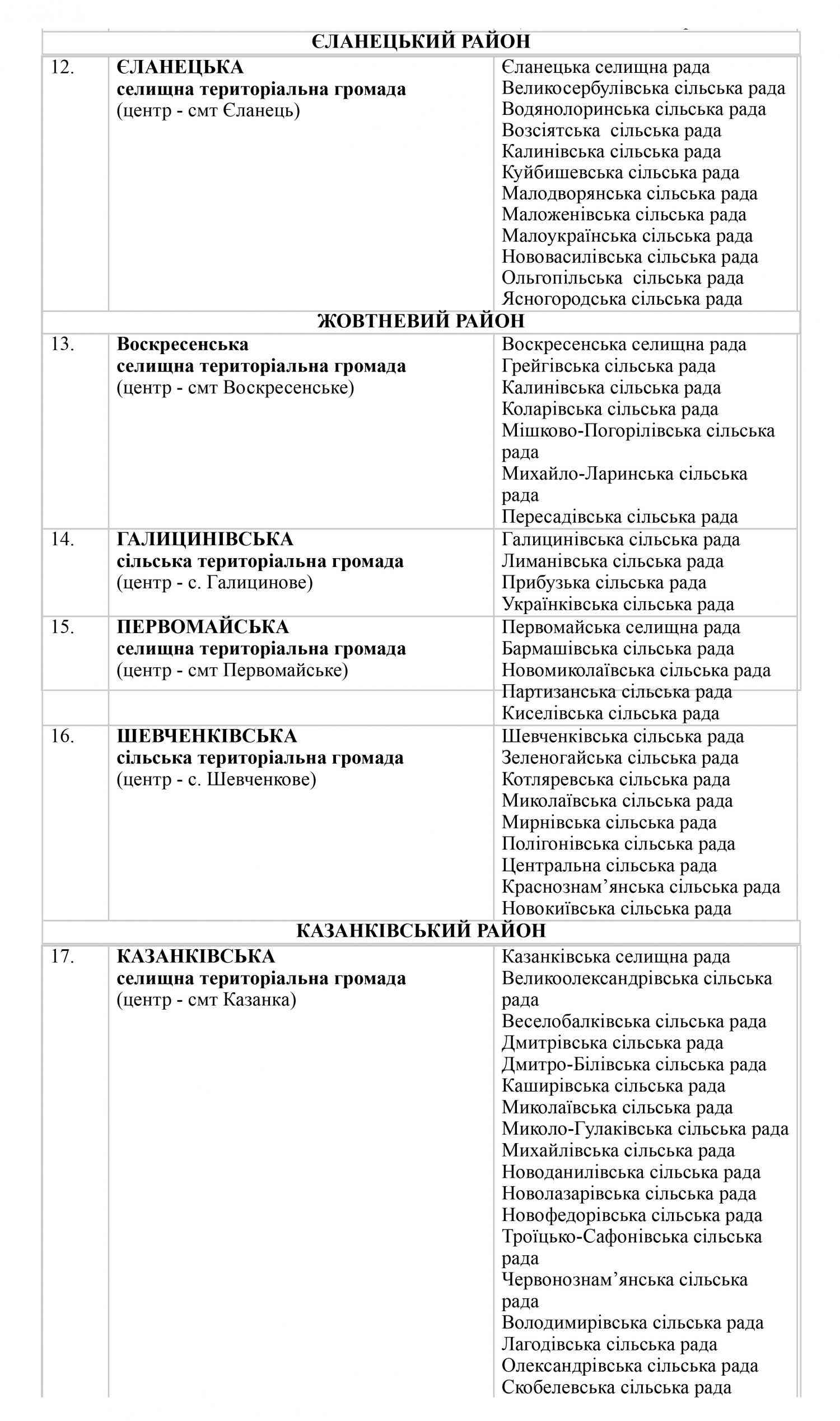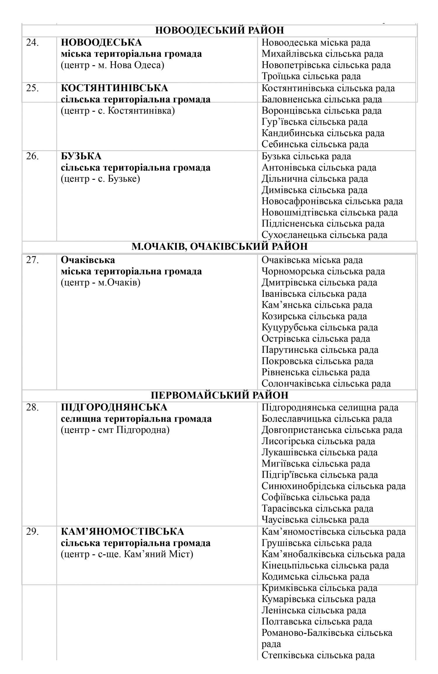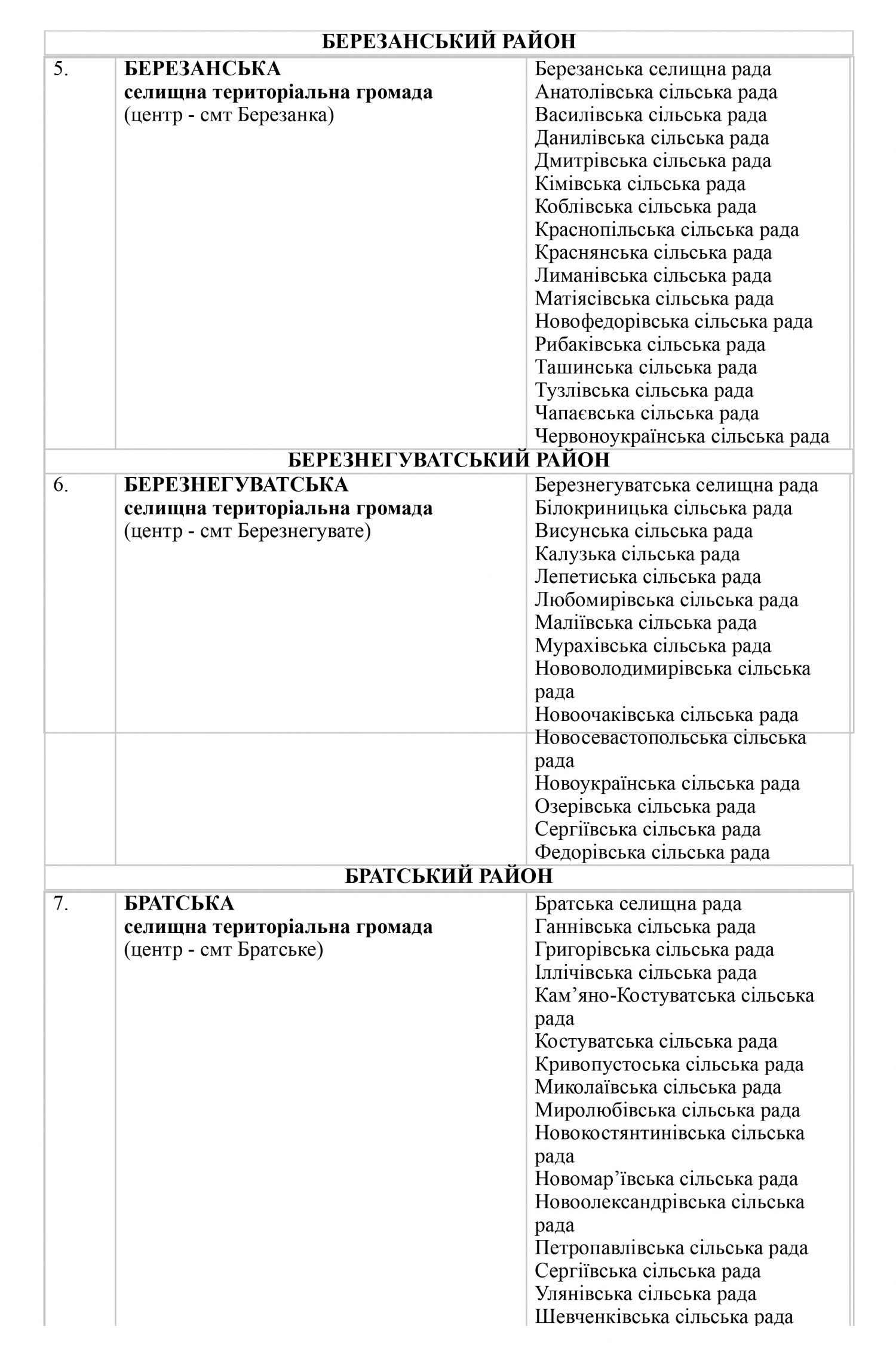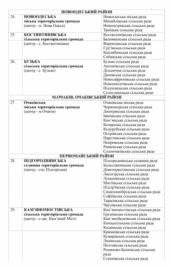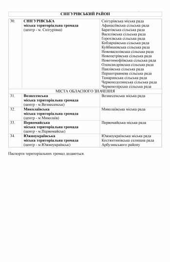 Кроме Арбузинской поселковой территориальной громады, Первомайской поселковой и Шевченковской сельской общин Октябрьского района, Снигиревской городской общины, при формировании других городских, поселковых и сельских территориальных общин не предусмотрено изменение существующих границ районов.