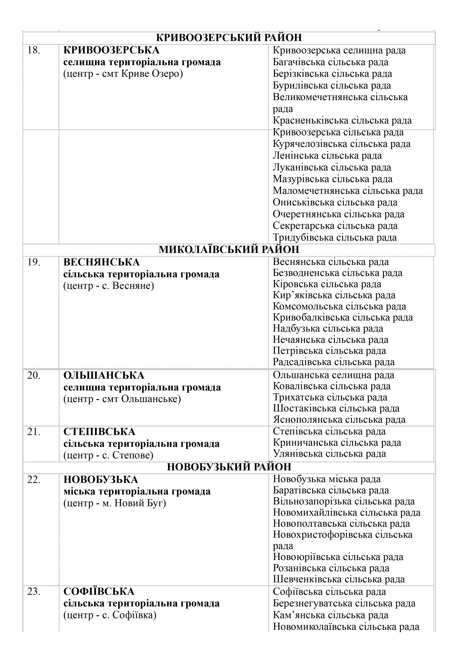 Вознесенская, Николаевская, Первомайская территориальные общины создаются в действующих границах соответствующих городских советов. Южноукраинская территориальная община создается путем объединения Южноукраинского городского совета и Константиновского сельского совета Арбузинского района. Очаковская территориальная община образуется путем объединения территориальных общин Очаковского района и Очаковской городского совета.