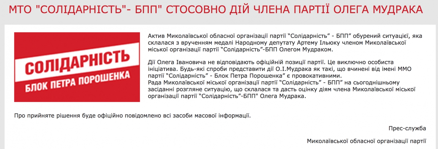 Николаевская областная организация партии «Солидарность — Блок Петра Порошенко» возмущена действиями депутата городского совета Олега Мудрака, который, будучи членом партии, вручил медаль ВМС народному депутату Артему Ильюку.
