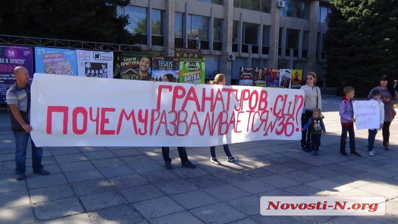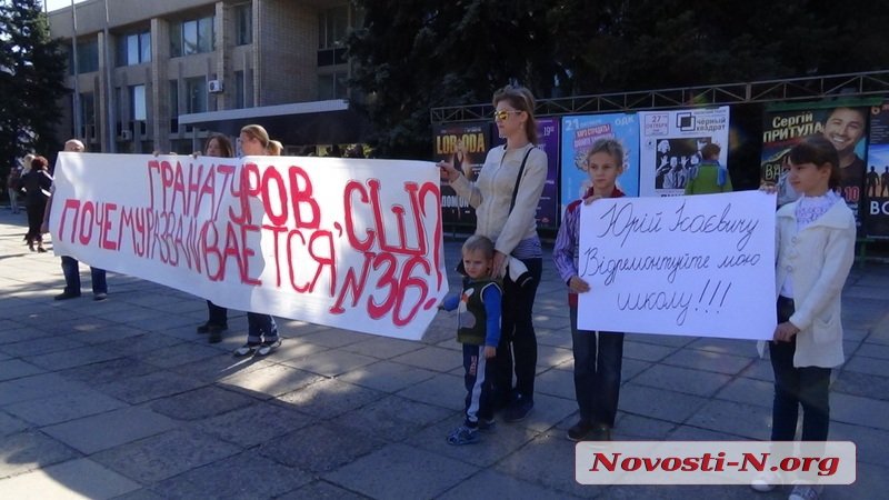 Между тем сегодня в 13:00 дня на площадке перед Областным дворцом культуры, где должно было начаться очередное торжество, посвященное Дню учителя, собрались несколько пикетчиков, которые растянули огромный, в несколько метров, баннер с надписью: «Гранатуров, почему разваливается СШ№36?». Двое детей стояли рядом с плакатом (дословно): «Юрій Ісаєвичу. Відремонтуйте мою школу!!!».
