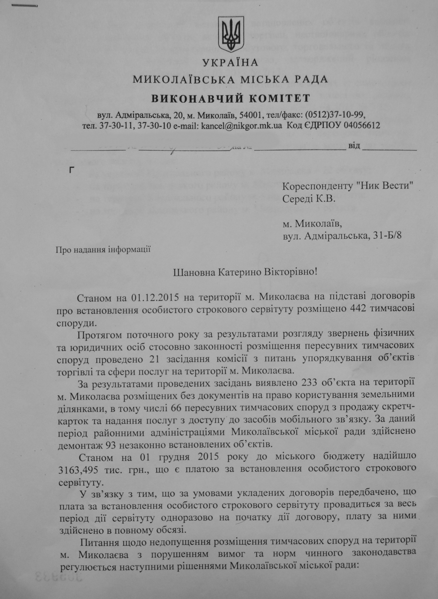 Сообщается, что состоянием на 1 декабря на территории Николаева на основании договоров об установке личного срочного сервитута размещено 442 временных сооружения.