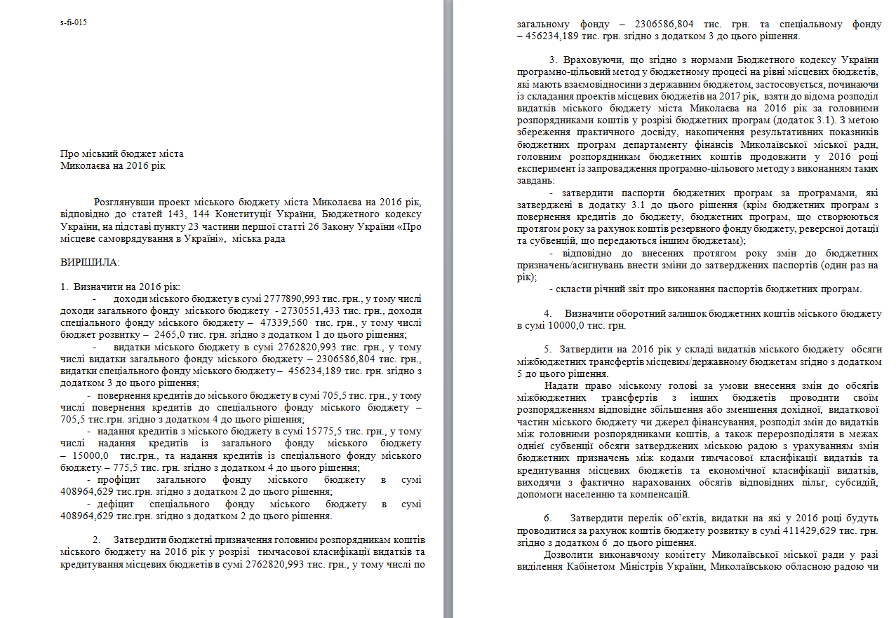 Депутатам Николаевского городского совета на следующей сессии предложат поддержать проект решения о бюджете города на 2016 год с общим объемом в 2 миллиарда 777 миллионов 890 тысяч 993 гривны.