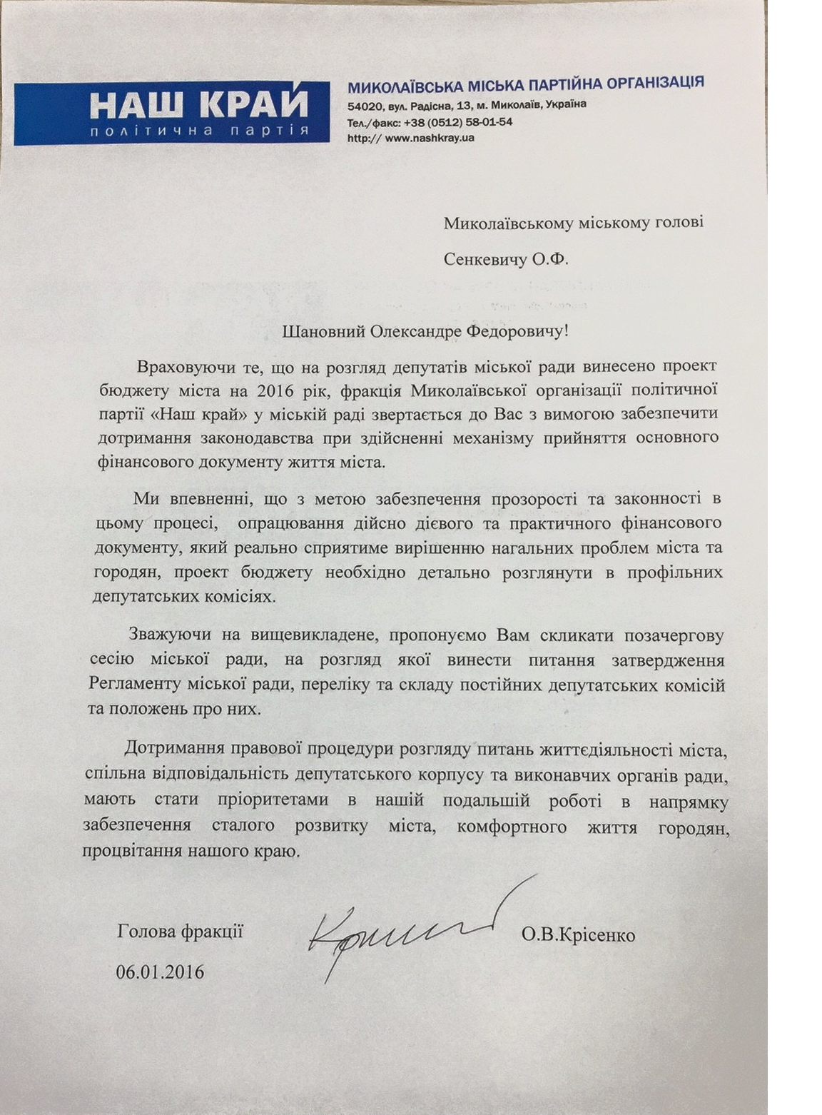 Об этом идет речь в официальном обращении фракции «Наш край» в Николаевском горсовете от 6 января 2016 года.