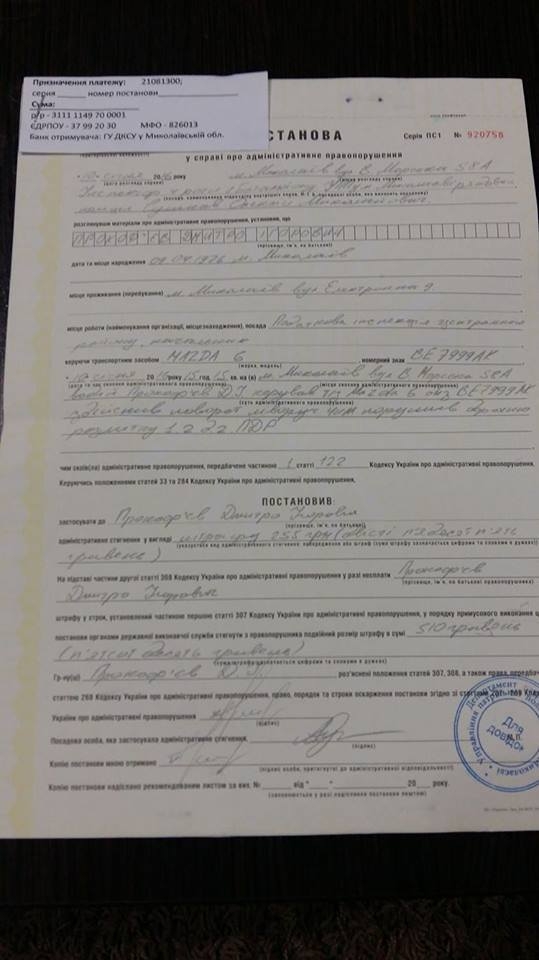 Начальник Центральной налоговой инспекции Николаева Дмитрий Прокофьев уплатил за парковку в неположенном месте 255 гривен согласно протоколу, который составили патрульные полицейские.