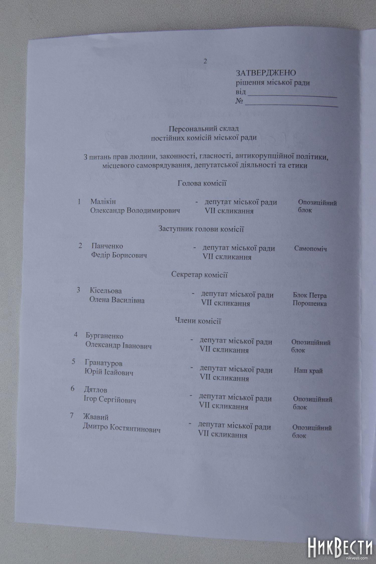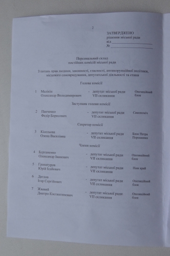 Комиссия по вопросам прав человека, законности, гласности, антикоррупционной политики, местного самоуправления, депутатской деятельности и этики - представитель фракции «Оппозиционный блок» Александр Маликин.