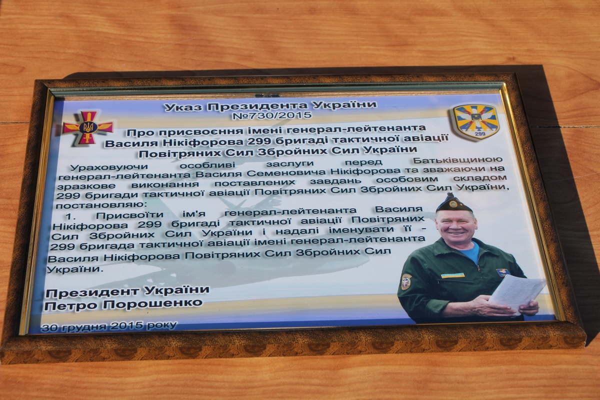 На торжественном построении был зачитан Указ Президента Украины о присвоении авиационному соединению имени генерал-лейтенанта Василия Никифорова. Копию этого приказа командующий вручил командиру соединения полковнику Александру Дякиву.