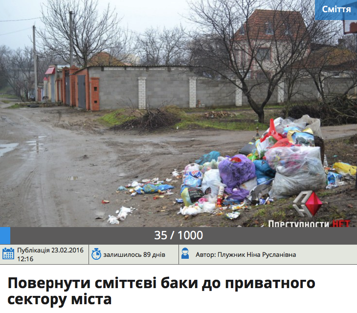 – Я плачу за каждого прописанного в моем доме, а это на минуточку около 80 гривен. Путем нехитрых расчетов, в среднем в месяц с одного квартала выходит около 567 гривен, с учетом в среднем 3 человека на дом, и 10 домов в одном квартале. И это еще не учитывая то, что очень много домов на несколько хозяев. Так вот и что мы получаем за эти деньги – разорванные пакеты и разбросанный мусор. Не знаю, как кому, но мне неприятно идти по улице и видеть кучи мусора, пакетов и другое, - написала автор петиции Нина Плужник.