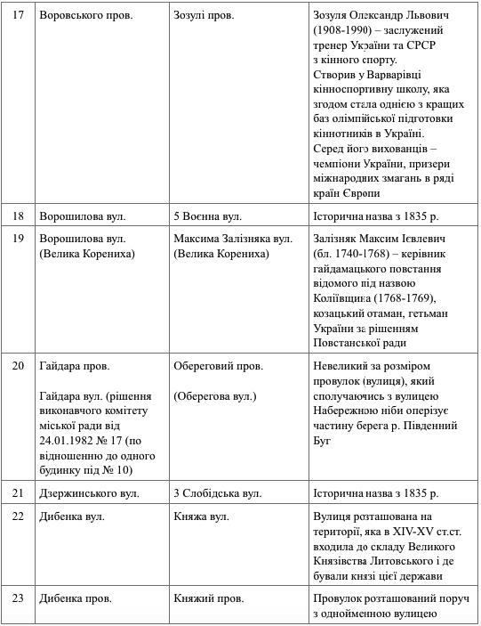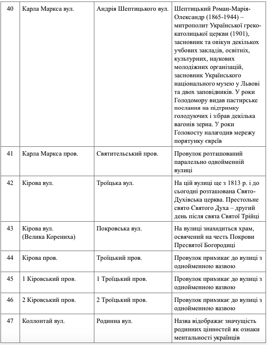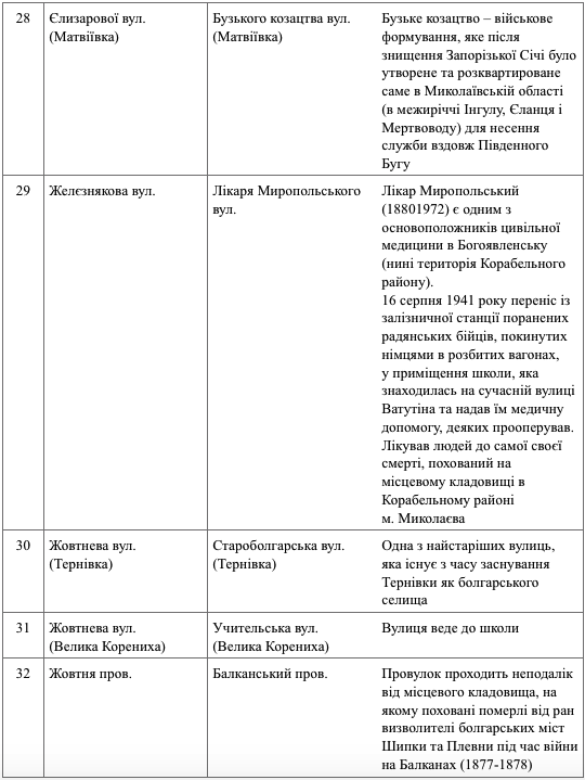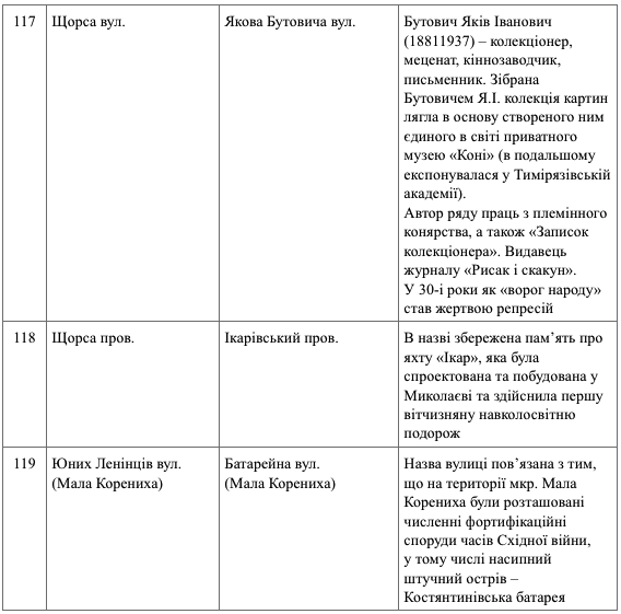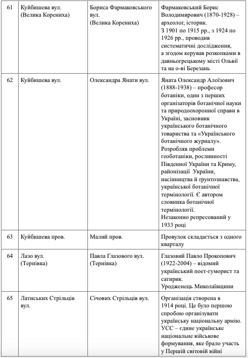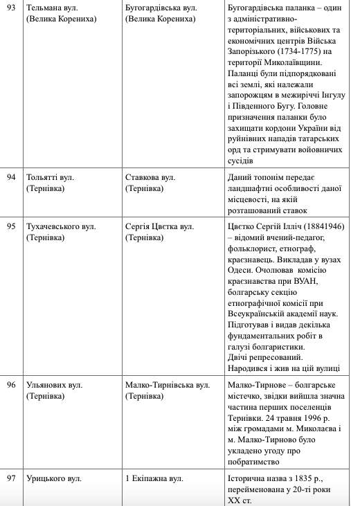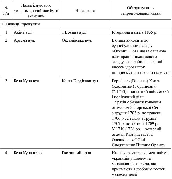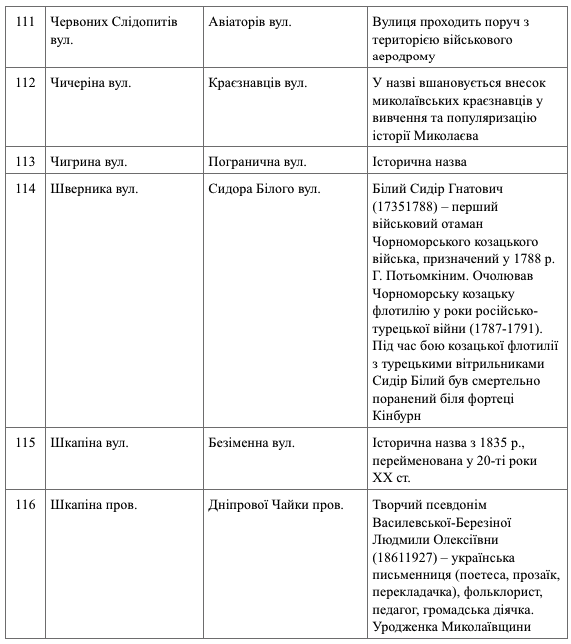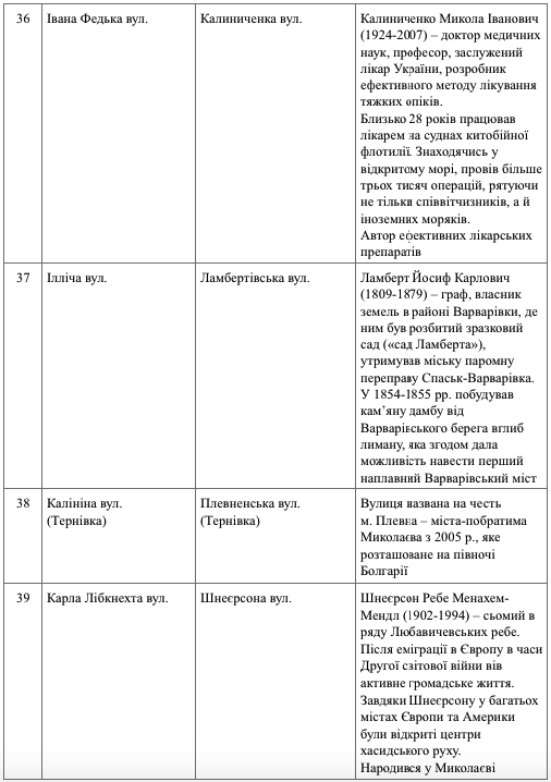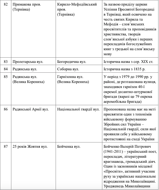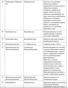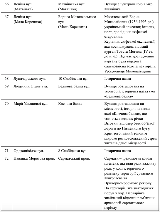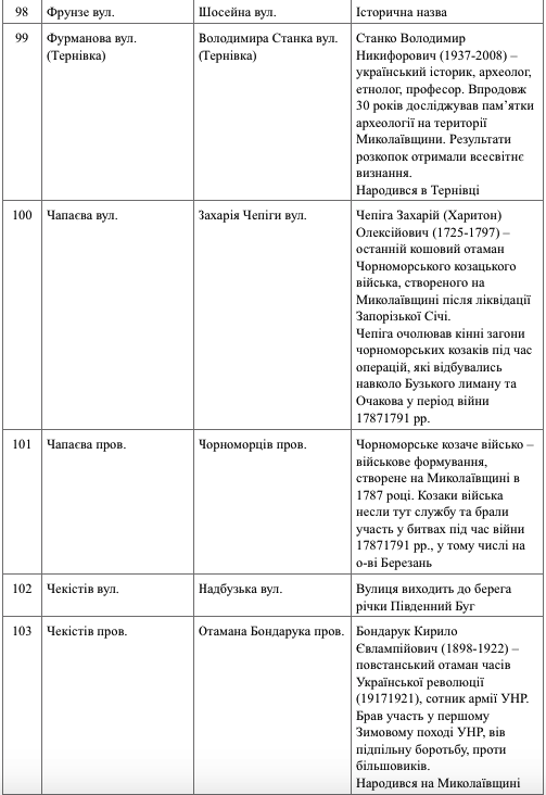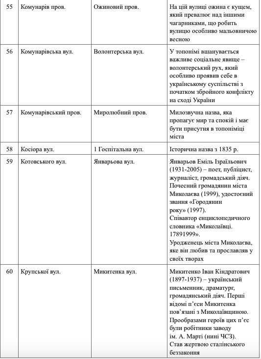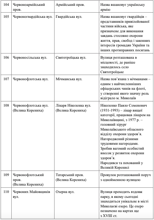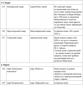 На сайте Николаевского городского совета был опубликован полный перечень объектов топонимики, которые были переименованы распоряжением мэра города Александра Сенкевича во исполнение закона «о декоммунизации».