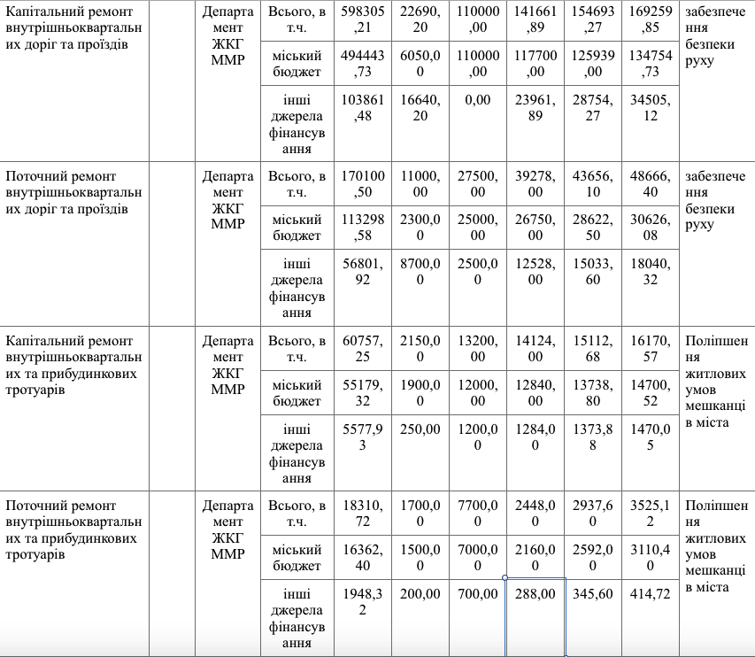 Большая часть этих денег, почти 160 миллионов гривен, будет направлена на осуществление текущего и капитального ремонта внутриквартальных дорог и проездов, а также капитального ремонт внутриквартальных тротуаров.