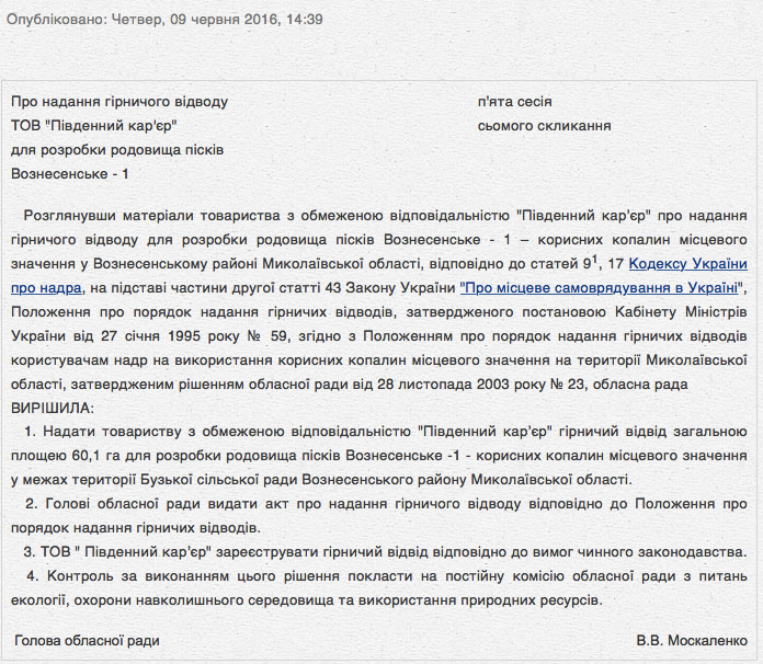 В связи с этим, стоит отметить, что проект решения Николаевского областного совета «О предоставлении горного отвода ООО «Южный карьер» для разработки месторождения песков Вознесенское –1» был опубликован на сайте облсовета вчера, 9 июня, в 14:39.