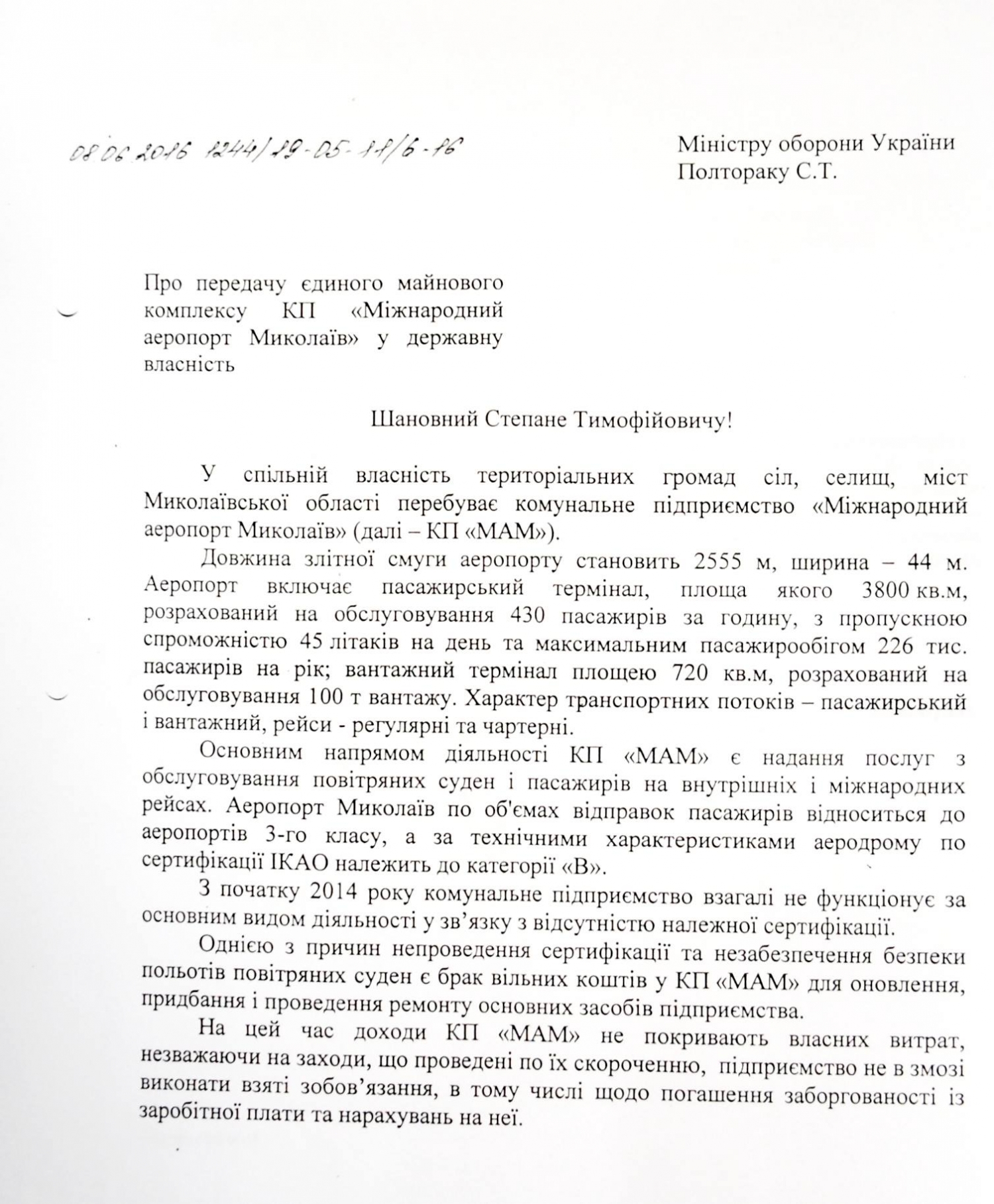Коммунальное предприятие «Международный аэропорт Николаев», принадлежащее областному совету, находится в плачевном состоянии: более 30 миллионов гривен долгов, отсутствие сертификатов, что делает невозможным прием-отправку самолетов, а также необходимость восстановления аэровокзала и взлетной полосы, без которых инвесторы отказываются работать. В связи с этим облгосадминистрация и облсовет направили письмо в Кабинет министров Украины и Мининфраструктуры с просьбой передать аэропорт в государственную собственность – ответ еще не получен. Об этом 13 марта рассказал глава облгосадминистрации Вадим Мериков при встрече с трудовым коллективом предприятия.
