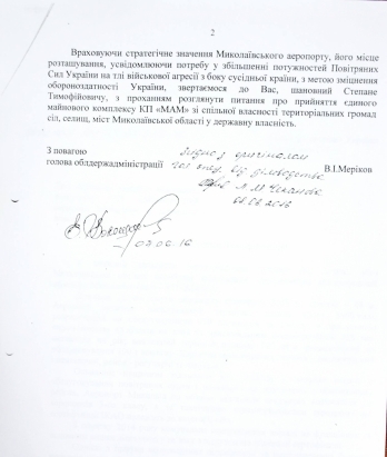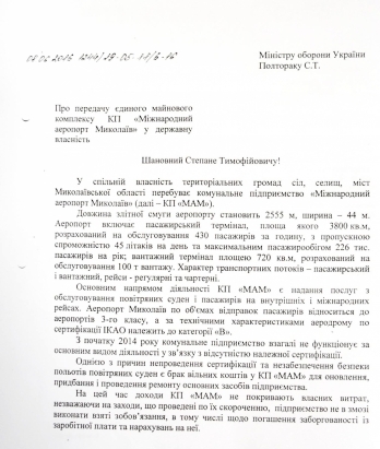 Председатель Николаевской облгосадминистрации Вадим Мериков направил обращение министру обороны Украины Степану Полтораку с просьбой принять коммунальное предприятие «Международный аэропорт «Николаев» в госсобственность. В случае положительного решения этого вопроса николаевской аэропорт будет использован для Военно-воздушных Сил Украины.