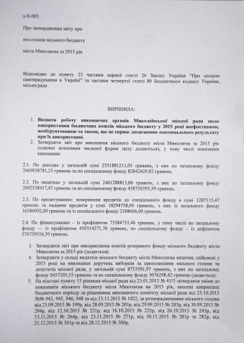 Всего проект решения «Об утверждении отчета об исполнении городского бюджета города Николаева 2015 года» поддержали 46 депутатов.