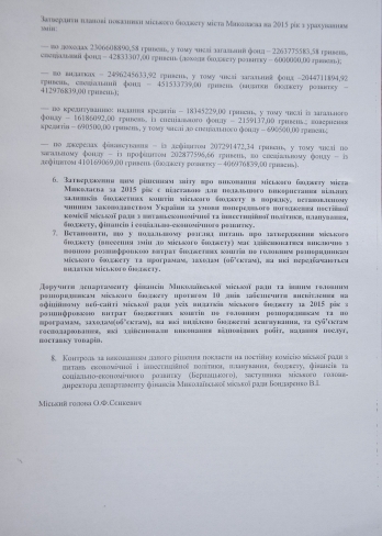 — Признать работу исполнительных органов Николаевского городского совета по использованию средств городского бюджета в 2015 году неэффективной, необоснованной и не способствующей достижению максимального результата. Утверждение этим решением отчета о выполнении городского бюджета города Николаева 2015 года является основанием для дальнейшего использования свободных остатков бюджетных средств городского бюджета в порядке, установленном действующим законодательством Украины при условии предварительного согласования постоянной комиссией городского совета по вопросам экономической и инвестиционной политики, планирования, бюджета, финансов и социально-экономического развития. Установить, что в дальнейшем рассмотрение вопросов об утверждении городского бюджета (внесение изменений в городской бюджет) должно осуществляться исключительно с полной расшифровкой затрат бюджетных средств по главным распорядителям городского бюджета и программам, мероприятиям (объектам), на которые предусматриваются расходы городского бюджета, - предложил Александр Бернадский.