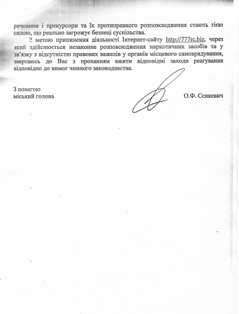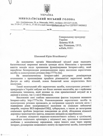 Николаевский городской голова Александр Сенкевич направил письмо в адрес Генерального прокурора Украины Юрия Луценко с просьбой принять меры по прекращению функционирования интернет-сайта, который рекламирует продажу наркотических средств и психотропных веществ.