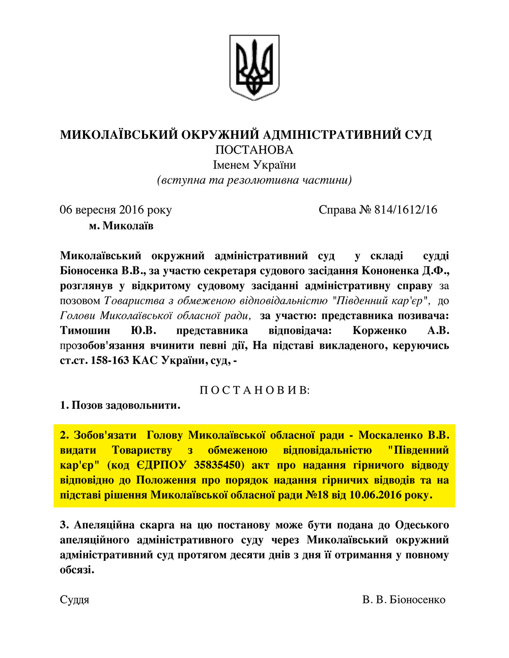 Николаевский окружной административный суд своим постановлением от 6 сентября обязал главу облсовета Викторию Москаленко выдать акт о предоставлении горного отвода ООО «Южный карьер» на основании решения облсовета, принятого 10 июня этого года.