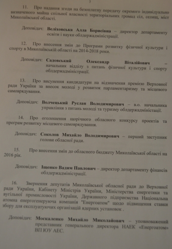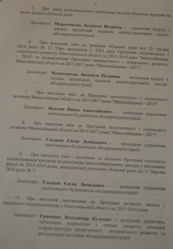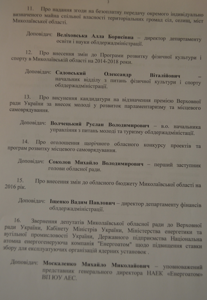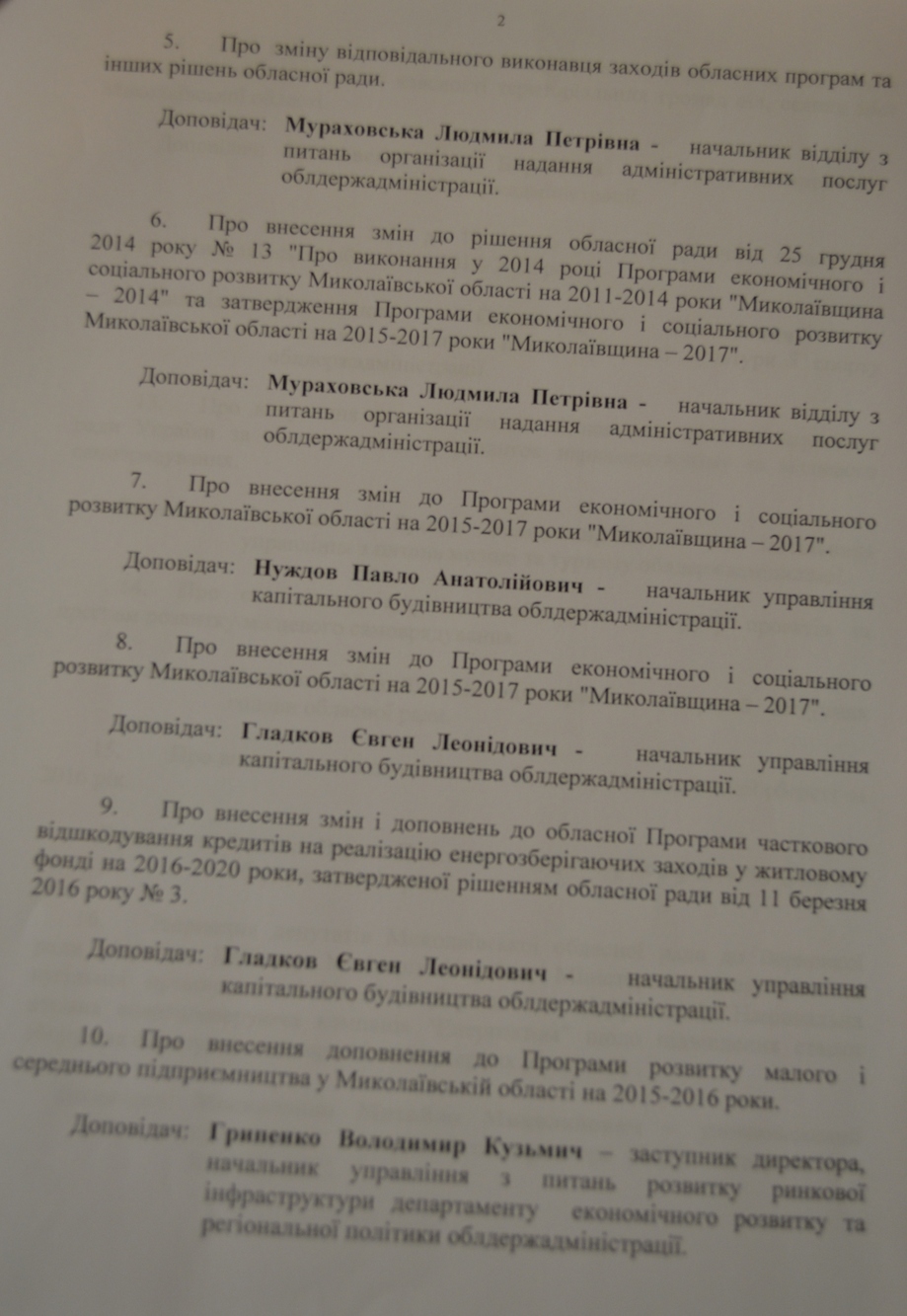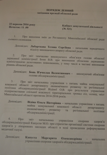 В частности, было предложено вместо отчета исполняющего обязанности председателя Николаевской облгосадминистрации Вячеслава Боня заслушать доклады о выполнении показателей программы социально-экономического развития (докладчик – директор департамента экономического развития ОГА Марина Васильева), о ситуации с ремонтом дорог (докладчик - начальник управления промышленности и развития инфраструктуры Эдуард Волошинович) и назначении руководителей коммунальных учреждений (докладчик – руководитель аппарата ОГА Андрей Ничипорчук), а также дополнительно информацию врио губернатора о состоянии дел в области.