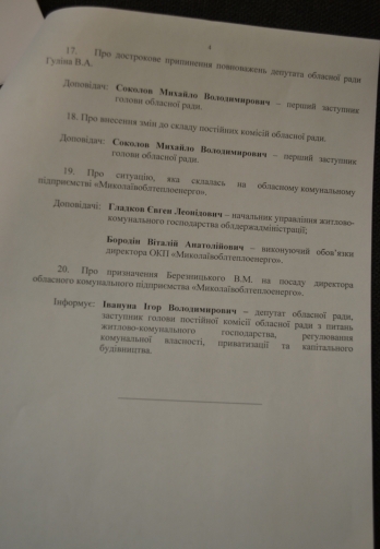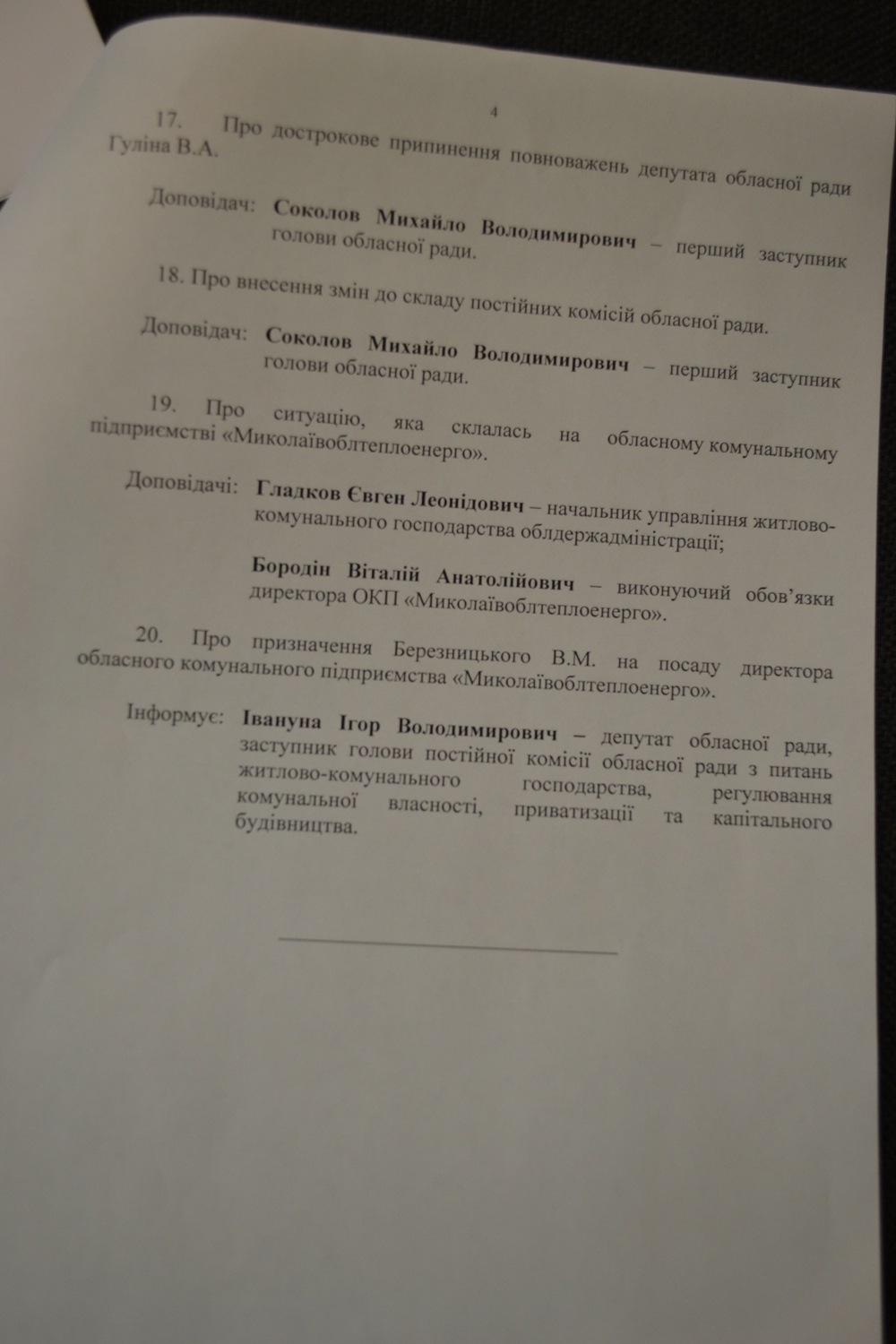 Кроме того, в повестку дня завтрашней сессии был включен спорный вопрос о назначении Владимира Березницкого новым директором «Николаевоблтеплоэнерго». За вынесение решения проголосовали 7 членов президиума, 6 – воздержались от голосования.