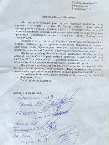 Народный депутат Давид Макарьян ведет переговоры с Владимиром Фроленко, руководителем фракции "Оппозиционный блок"Ранее депутат Николаевского облсовета Максим Невенчаный объявил на сессии, что депутаты облсовета собрали 28 подписей за недоверие Соколову.