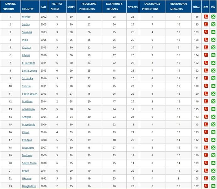 Законодательство Украины относительно доступа к информации заняло 22 позицию из 111 стран мира в Международном рейтинге обеспечения права на информацию.