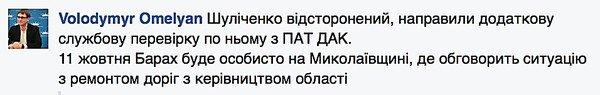 - Шуличенко отстранен. Направили дополнительную проверку по нему из ДАК «Автомобильные дороги Украины», - написал министр инфраструктуры Владимир Омелян в комментарии в соцсети Facebook.