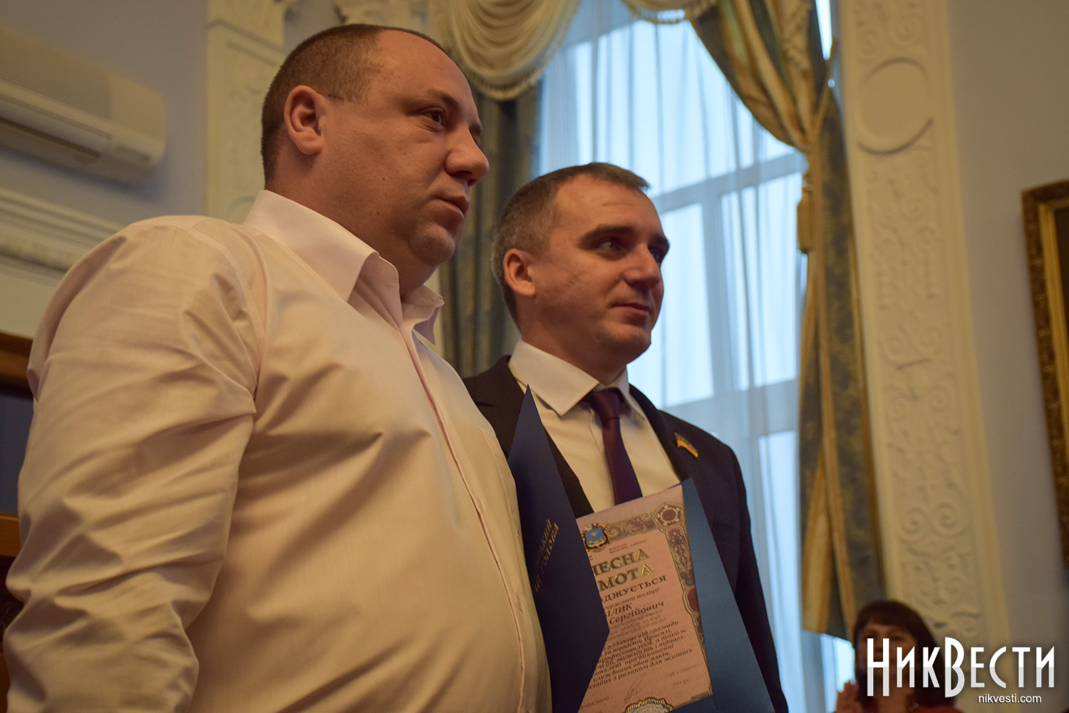 Сегодня, 10 ноября, перед началом заседания сессии Николаевского городского совета мэр Александр Сенкевич и депутаты аплодисментами приветствовали полицейских, которые вчера задержали вооруженных грабителей возле рынка «Колос» и помешали взрыву гранаты.