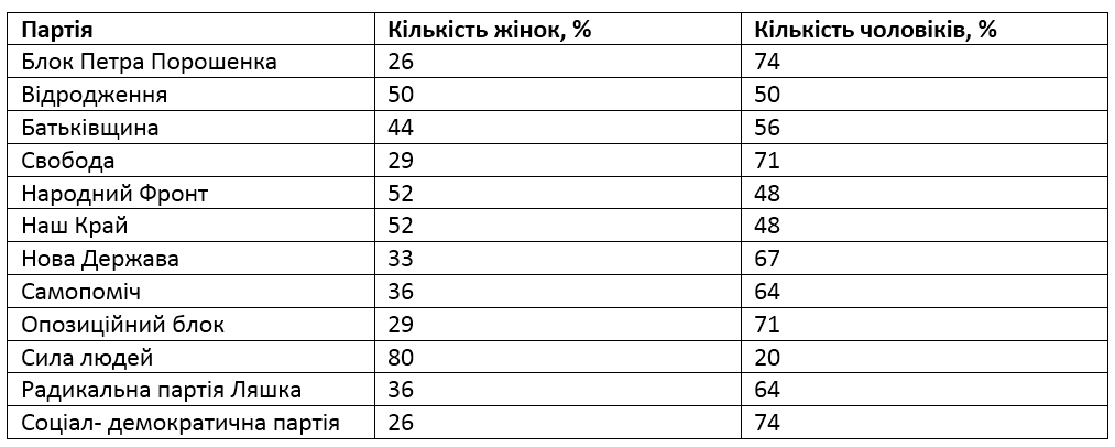 Не хватило одного процента для соблюдения «гендерной квоты» местным организациям партий «Свобода» и «Оппозиционный блок». Равное количество женщин и мужчин выдвинула в кандидаты местная организация партии «Відродження».