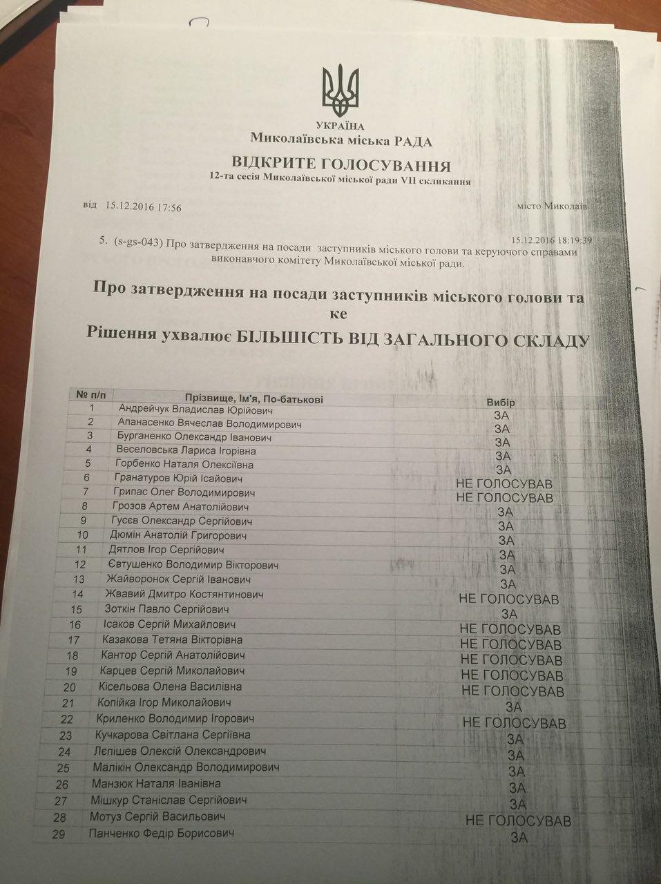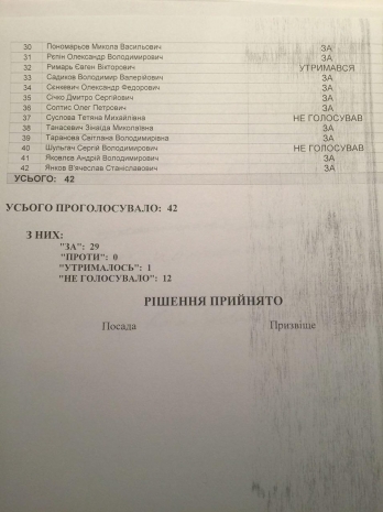 «За» проголосовали 29 депутатов - голоса не дали фракции «БПП» и «Наш край». Кроме того, депутаты фракции «Самопомощь» Сергей Исаков и Татьяна Суслова также отказались голосовать за предложенные кандидатуры заместителей мэра.