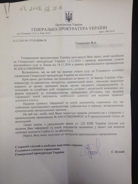В документе указано, что по состоянию на 16 декабря Генеральная прокуратура не получила из Апелляционного суда Киева постановление от 14 ноября. При этом указанное постановление вступило в законную силу в день принятия и кассационному обжалованию не подлежало.