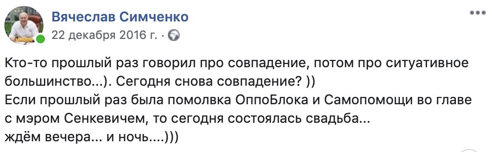 – Кто-то в прошлый раз говорил про совпадение, потом про ситуативное большинство... Сегодня снова совпадение? Если прошлый раз была помолвка ОппоБлока и Самопомощи во главе с мэром Сенкевичем, то сегодня состоялась свадьба... ждём вечера... и ночь... – добавил он.
