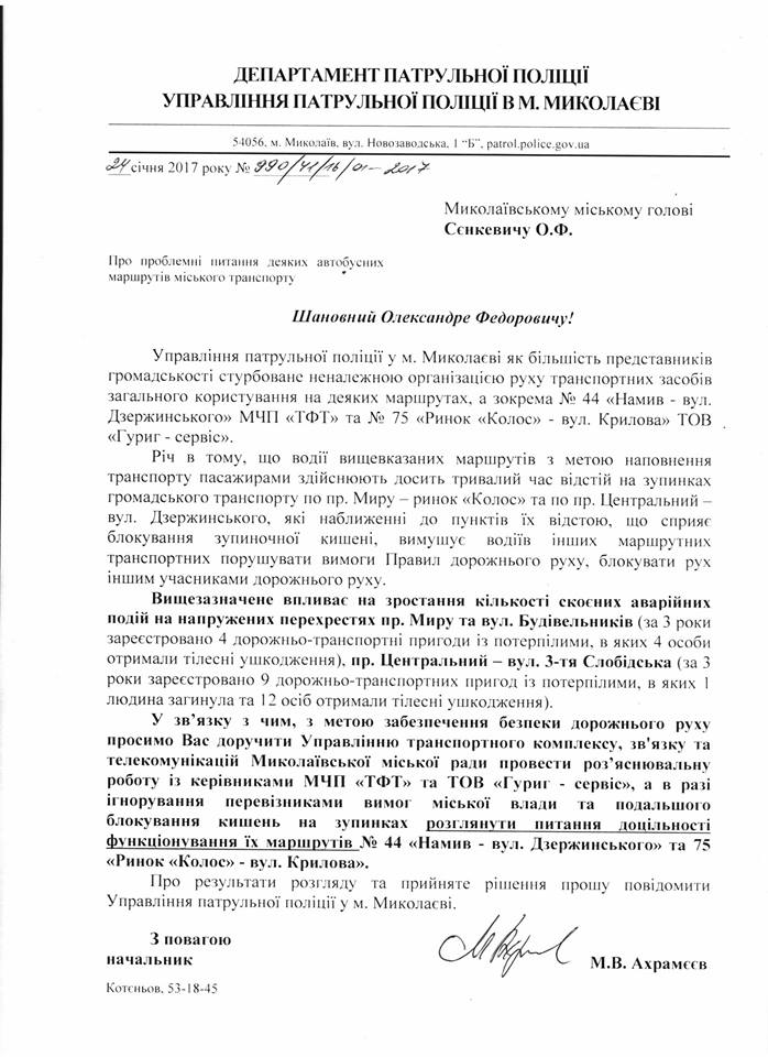 Работники сектора безопасности дорожного движения Управления патрульной полиции в Николаеве обратились к городскому голове с просьбой поручить Управлению транспортного комплекса, связи и телекоммуникаций Николаевского городского совета провести разъяснительную работу с руководителями МЧП «ТФТ» и ООО «Гуриг - сервис», а в случае игнорирования перевозчиками требований городских властей и дальнейшего блокирования карманов на остановках рассмотреть вопрос целесообразности функционирования их маршрутов № 44 «Намыв – улица 3-я Слободская» и № 75 «Рынок «Колос» - улицы Крылова».