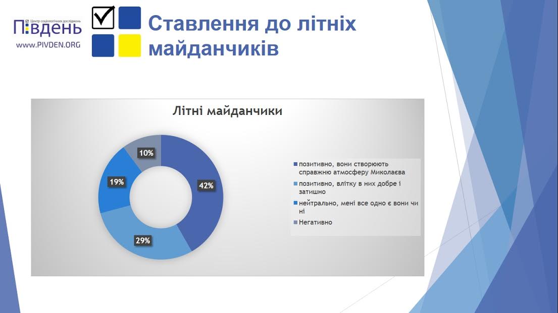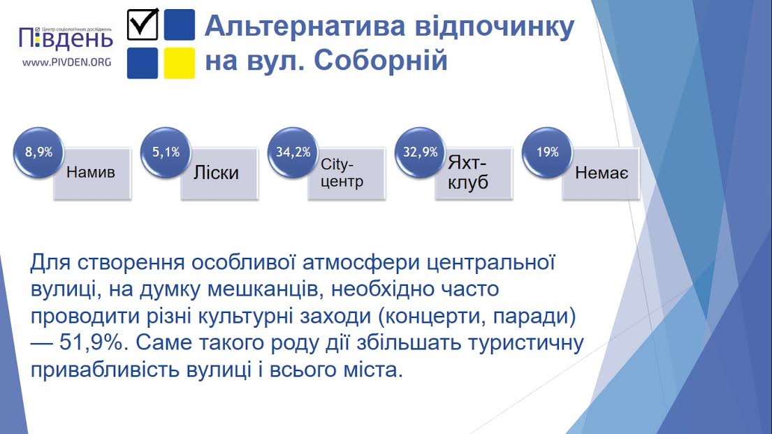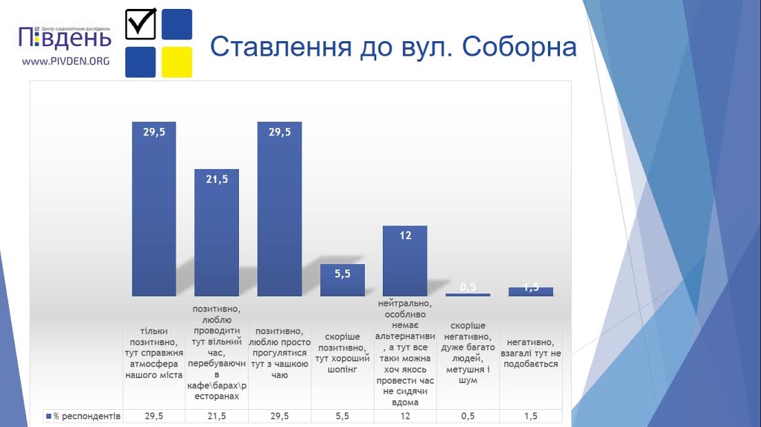 Главные тенденции, которые были обнаружены в данном опросе, это то, что посетители в целом довольны улицей Соборной, при этом безальтернативной для проведения свободного времени ее назвала почти пятая часть всех опрошенных николаевцев (19,0%).