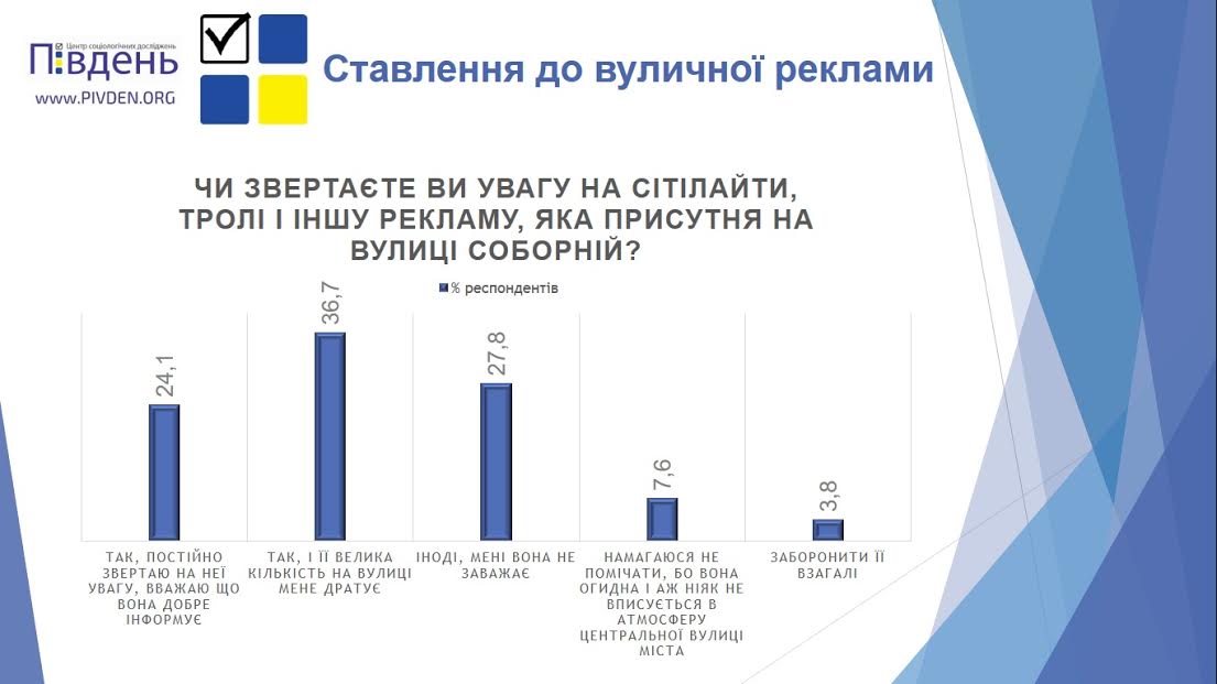 Стоит отметить, что 82% респондентов считают рекламу на Соборной такой, которая не мешает. По мнению отвечавших, она достаточно информативна и не портит общий вид улицы. Только 3,5% выбрали вариант вообще убрать ее, и 14,5% считают, что реклама является отвратительной.